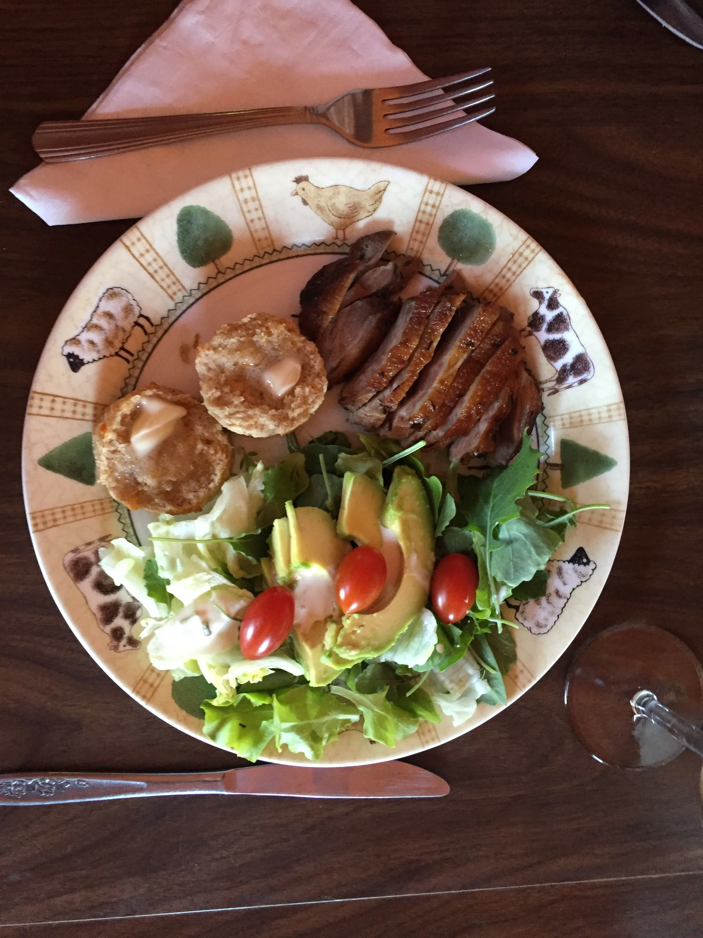Seared duck breast with salad and Michael’s whole wheat cheese biscuits.