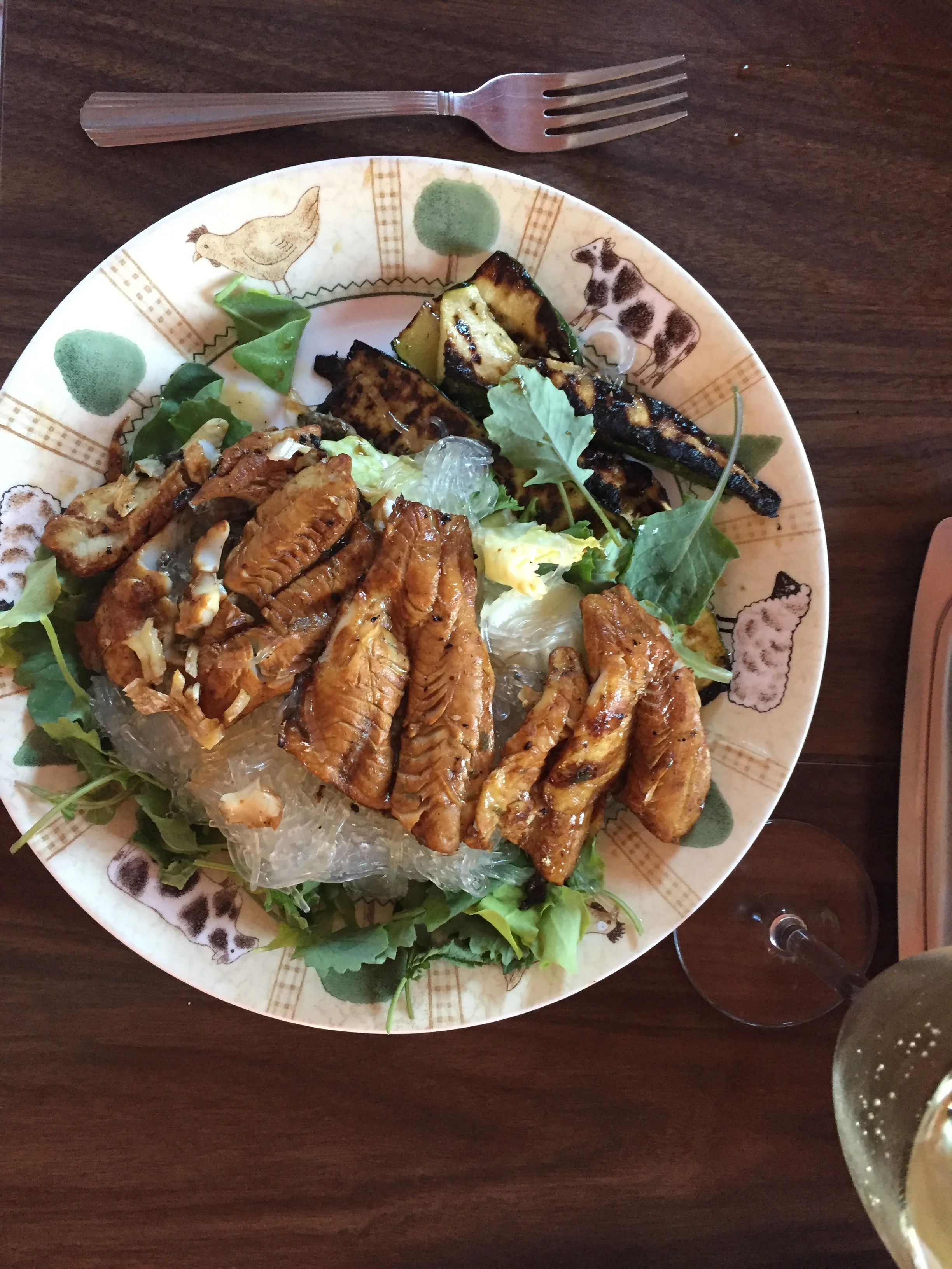 Grilled teriyaki fish and zucchini planks with salad and mung bean noodles.