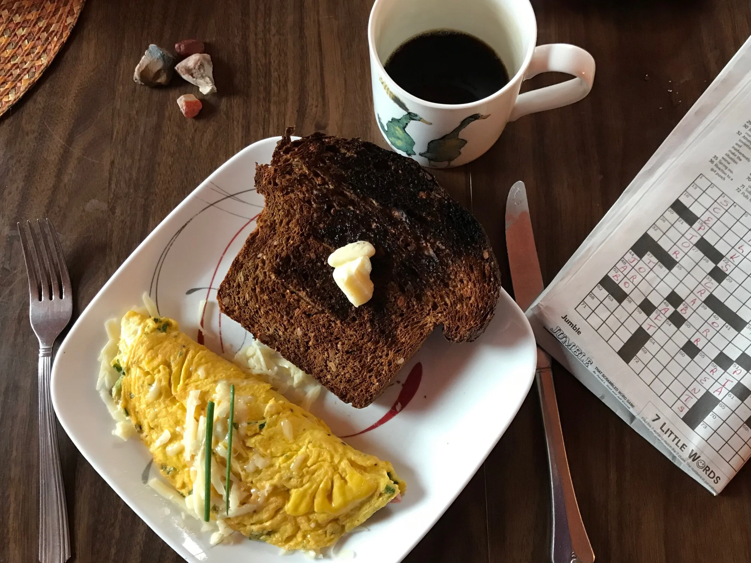 Holiday breakfast: home baked rye bread, butter, asparagus omelette. Black coffee. The NYT crossword. Rocks recovered on our dog walk to contemplate.