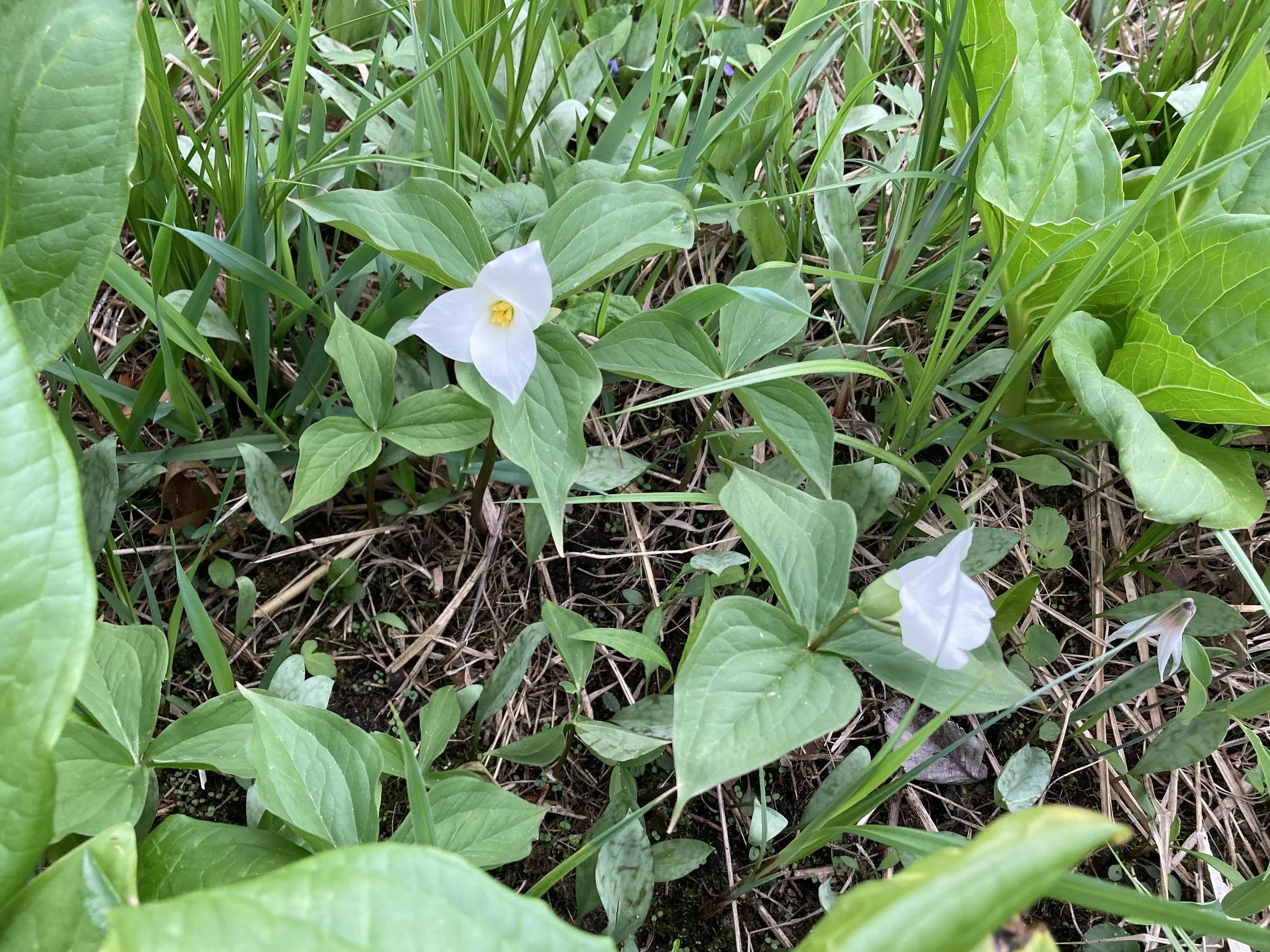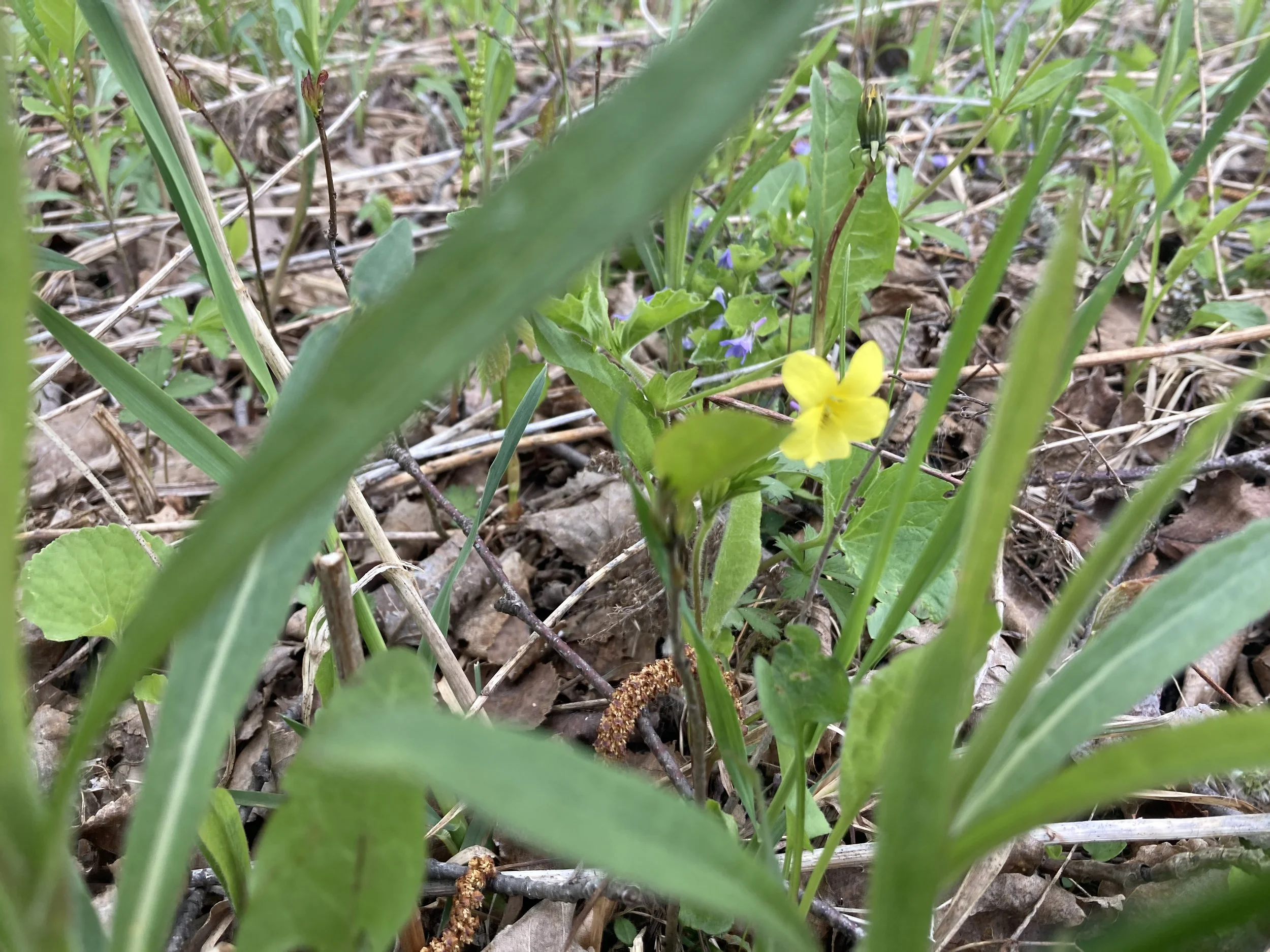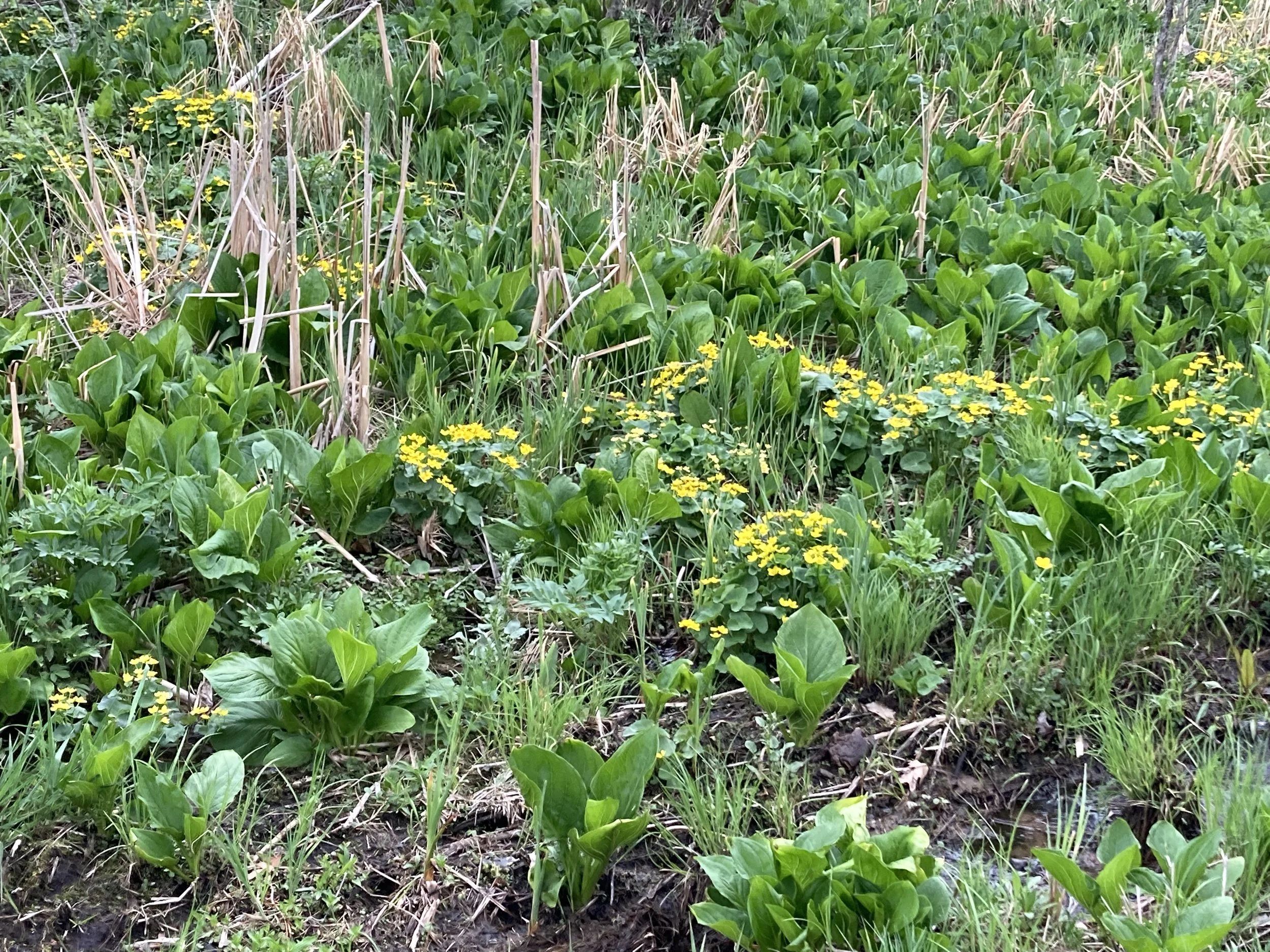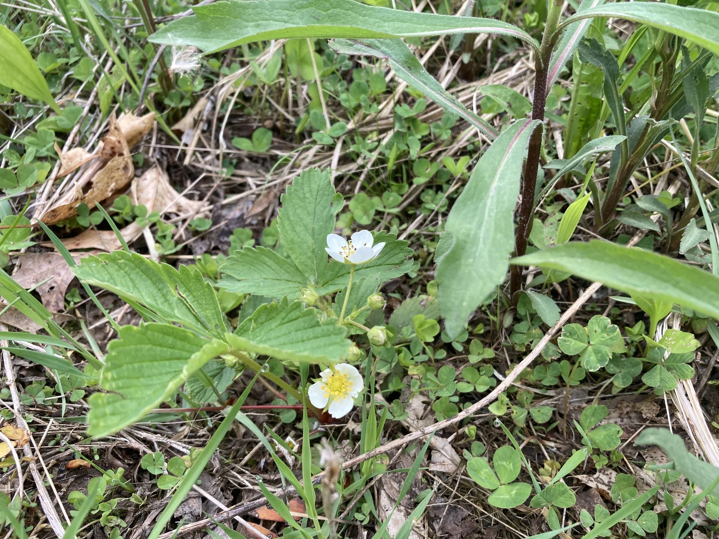 Penstemon, Sweet William, wild geraniums, mustard, strawberries, and yellow violets accent the intense and varied greens of spring.