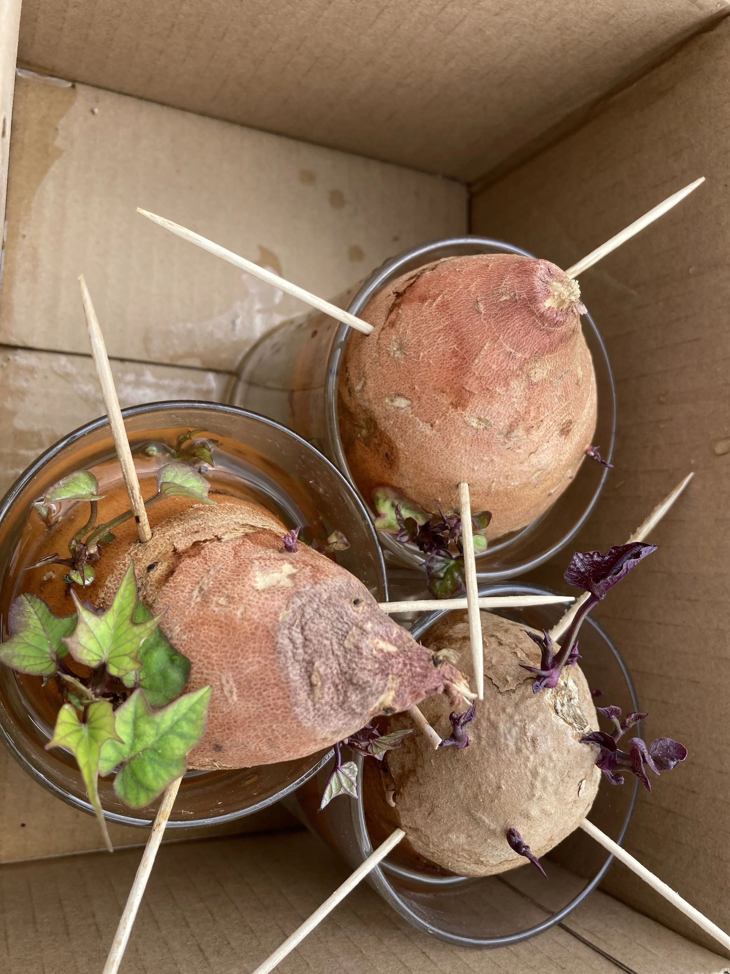 They share space with sweet potatoes, green beans, peas, peppers, and lettuce.