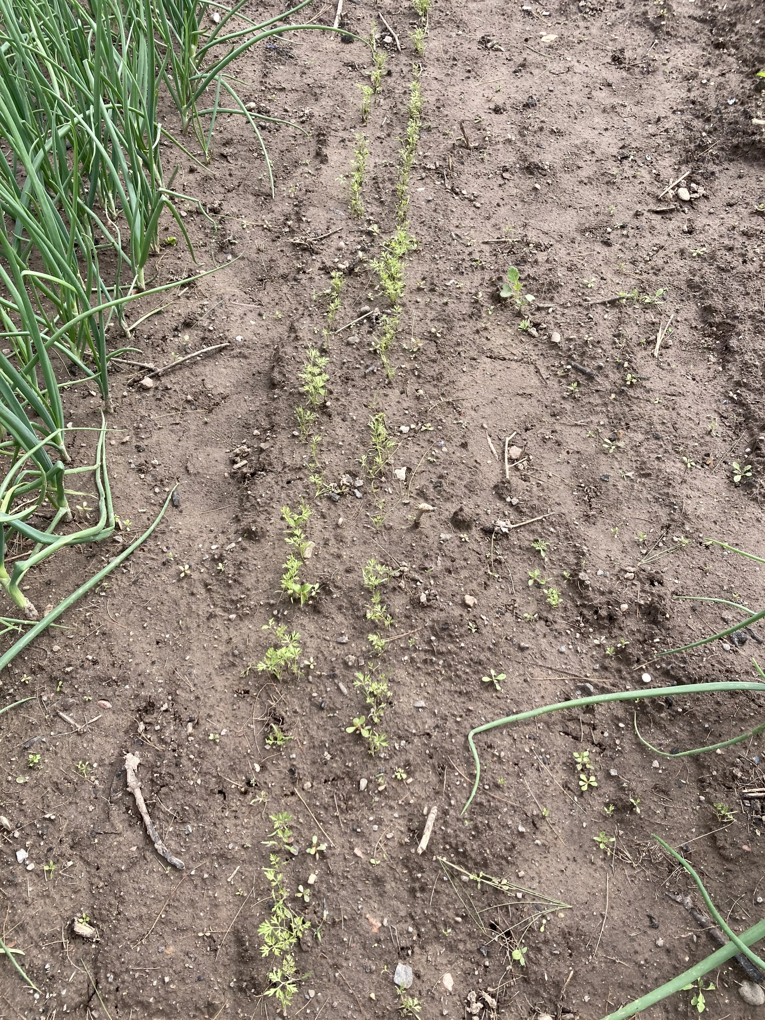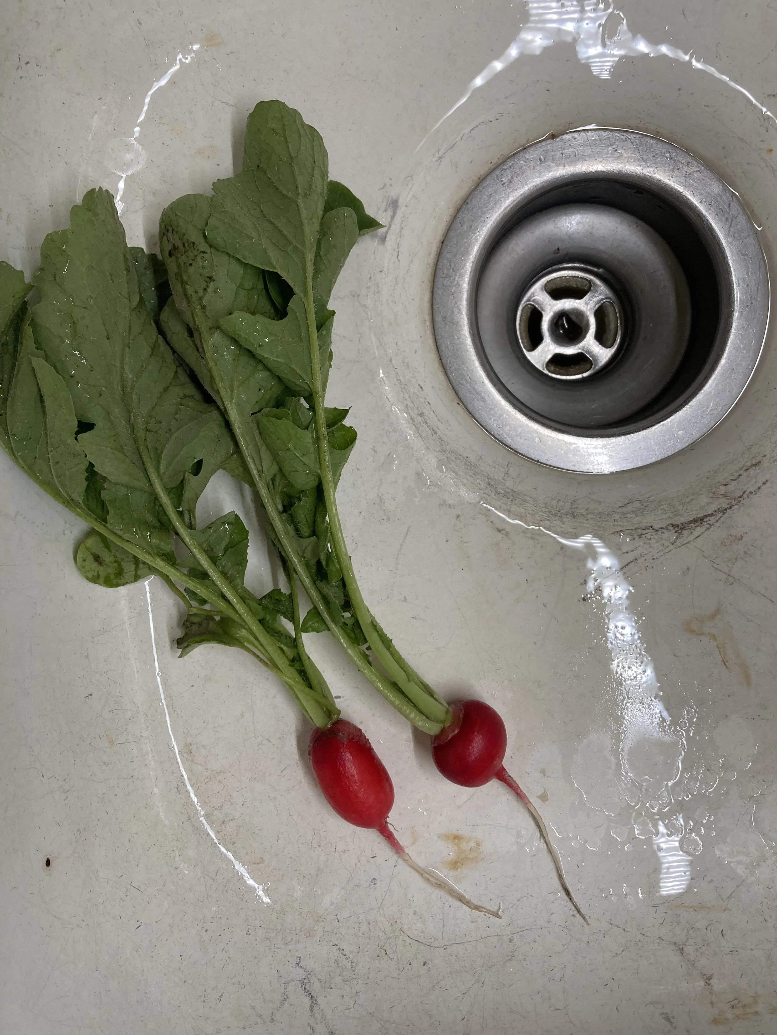 Our first radishes: Thursday June 6. Crisp and mild, they have benefited from the near-constant rain we have received.