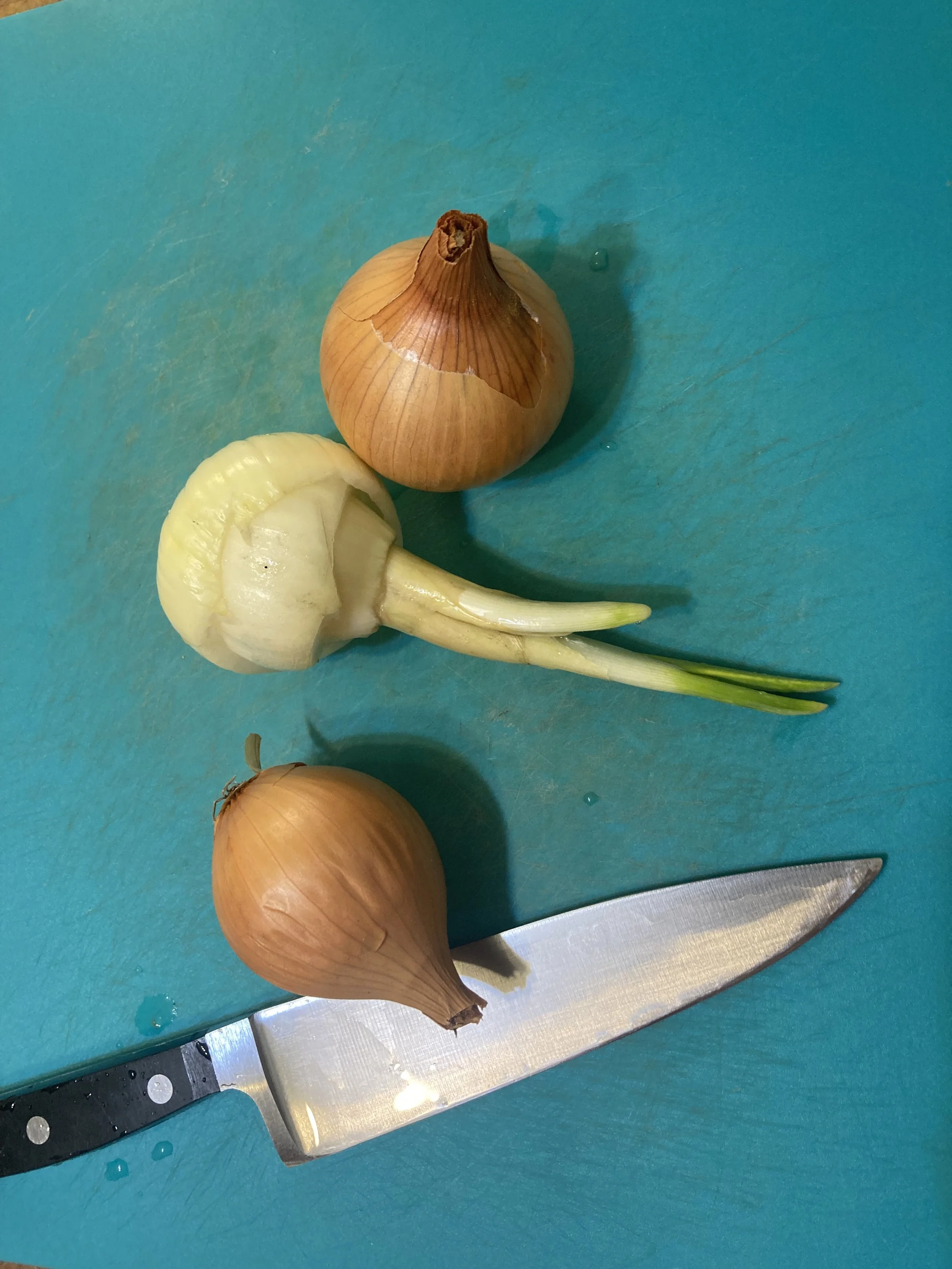 Onions! No bottoms yet, but we sneak some of the tops into pasta, guacamole, and anywhere else we can.