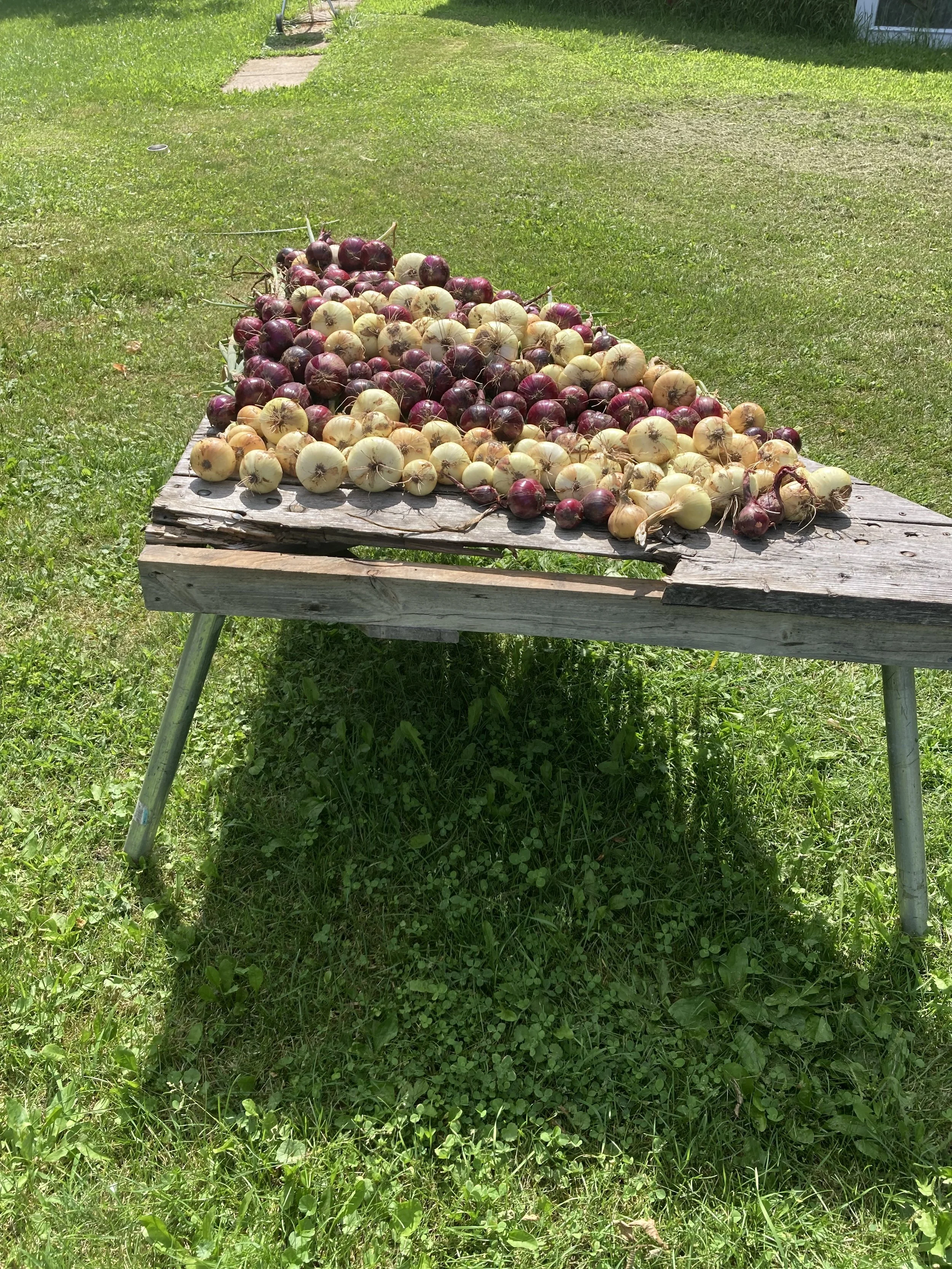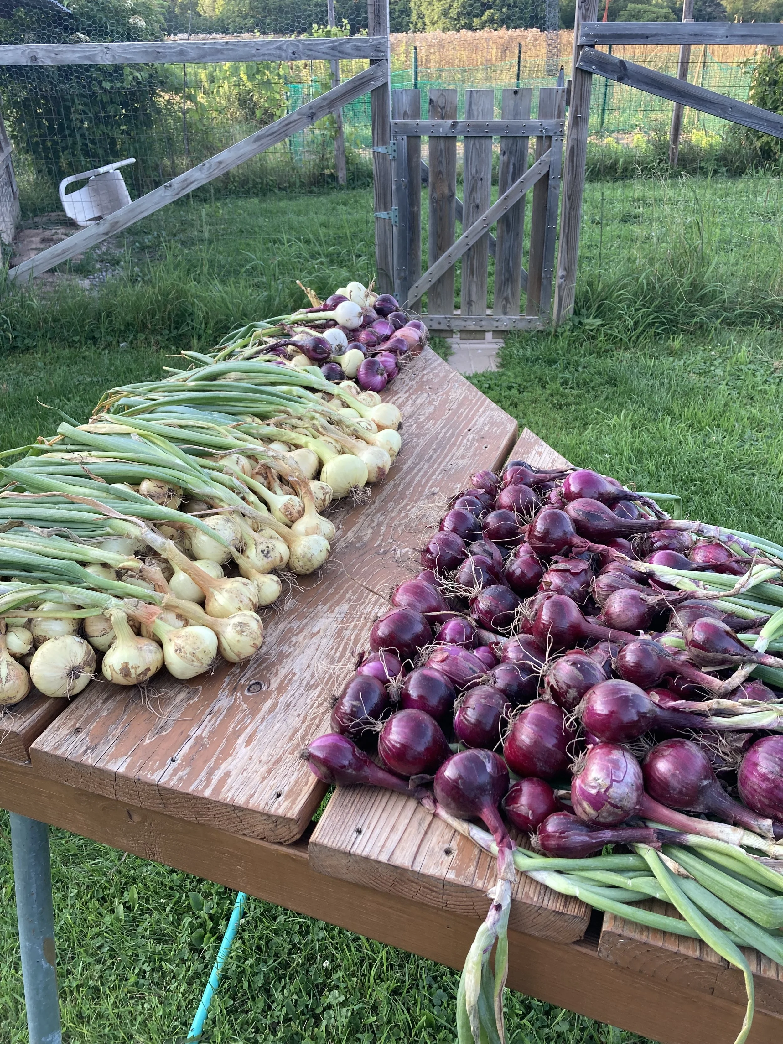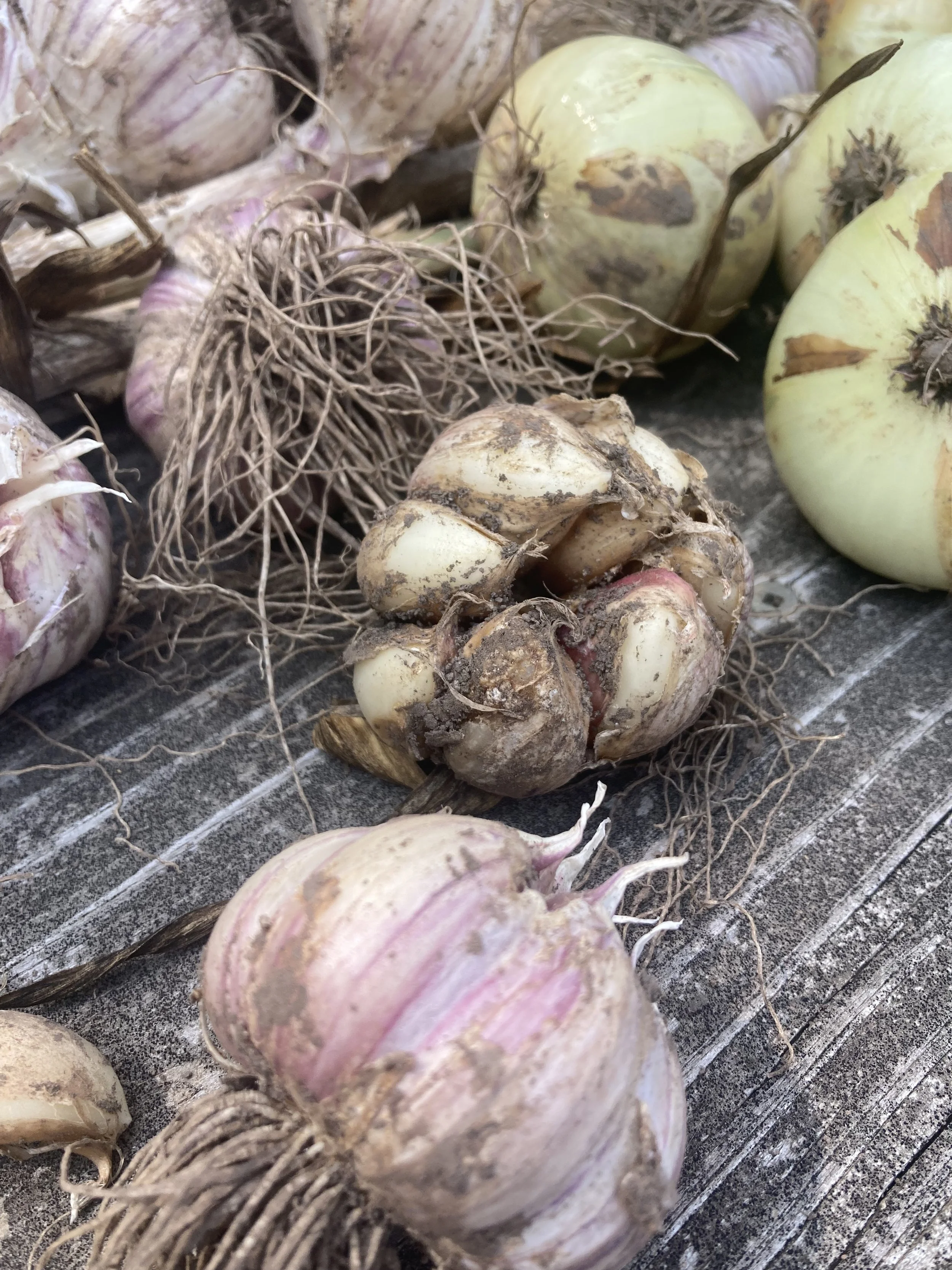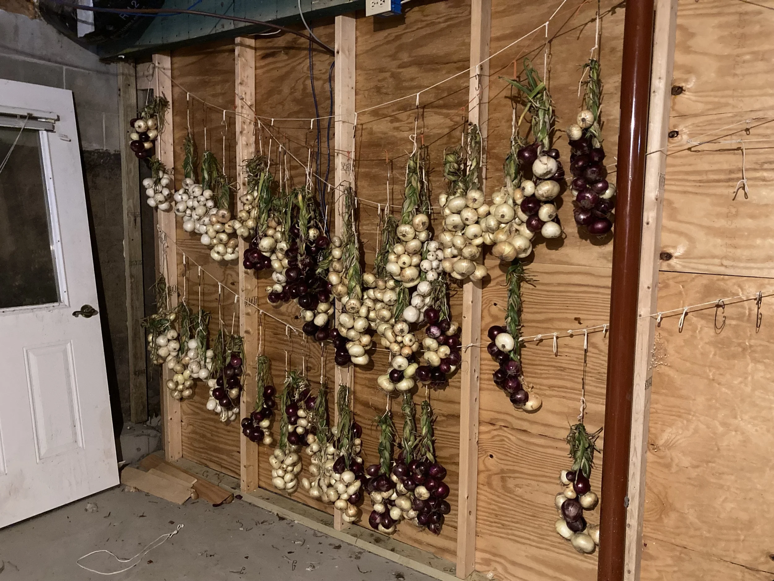 We grow four varieties of garlic: two hard neck and two soft neck. The “neck” refers to the stems. These are River Giant, and they loved the weather this year! Only a few tried to bolt (creating a hard neck in a soft neck variety), so I was able to braid them easily. I will bundle the hard necks. All will go down into the basement, where it is dry, cool, and dark. We are just finishing off last year’s garlic, which means we planted enough, but not too much. The soft necks tend to last longer than the hard neck varieties, as the paper around each clove clings tighter, protecting them from dehydration.
