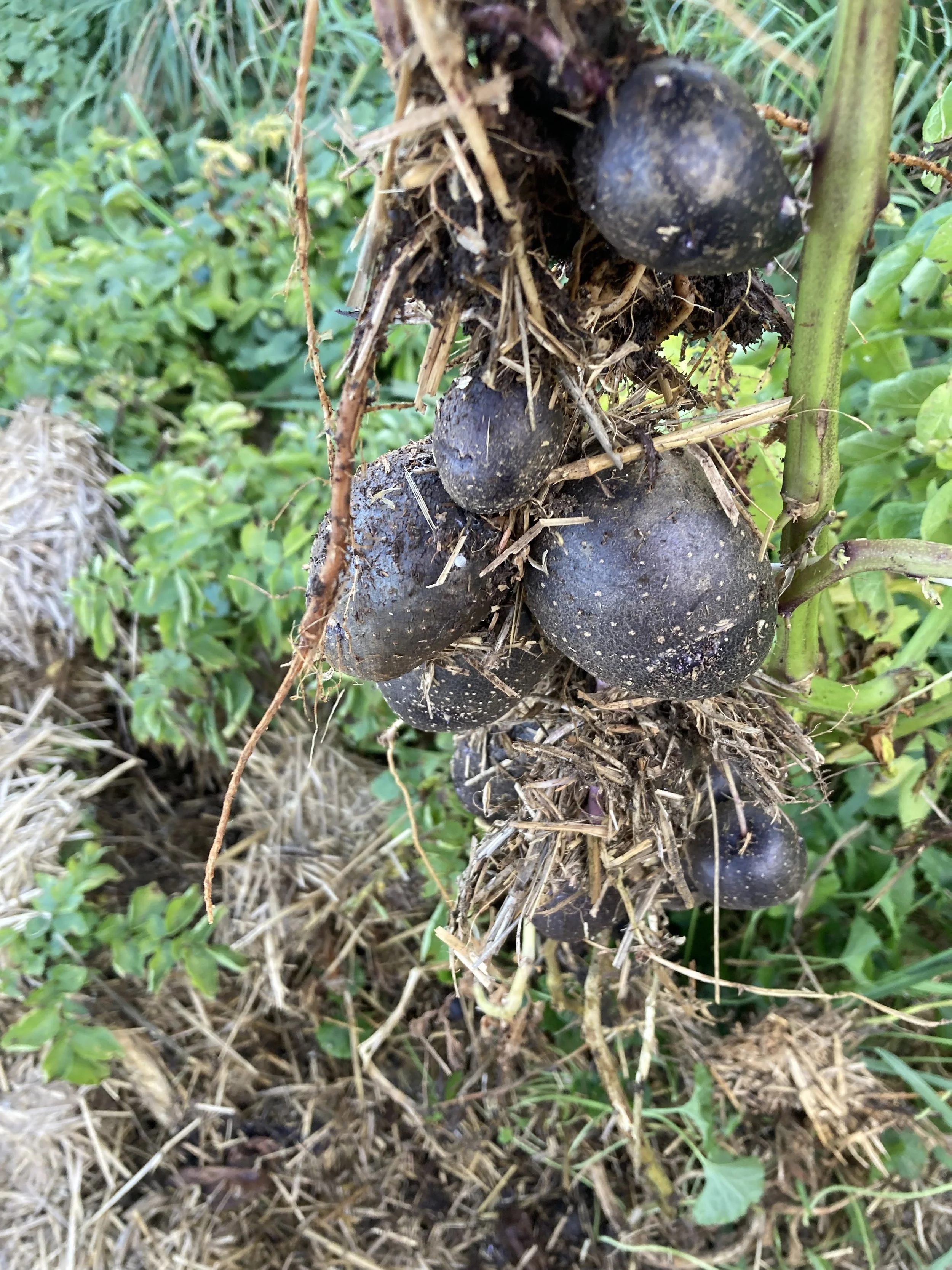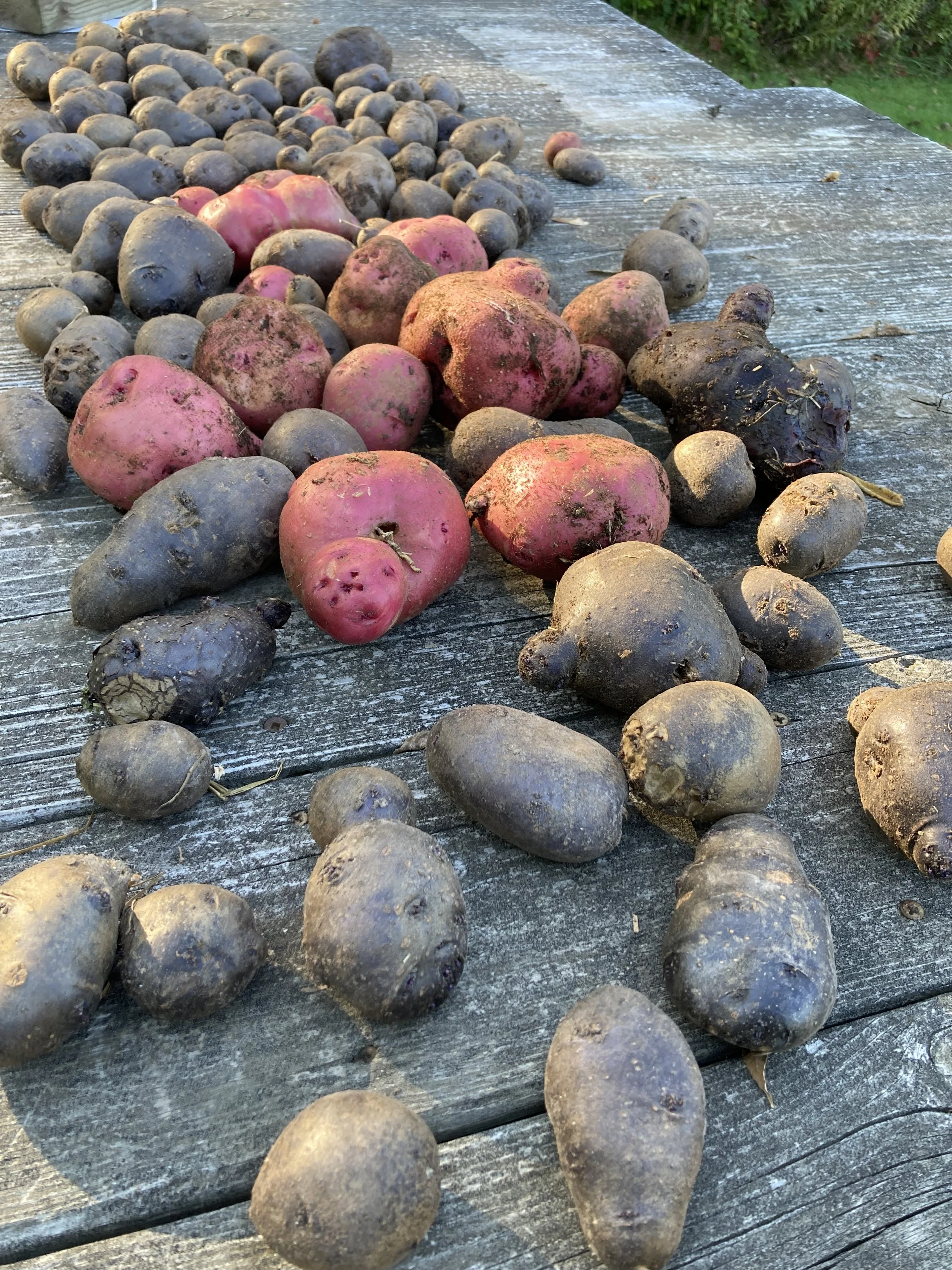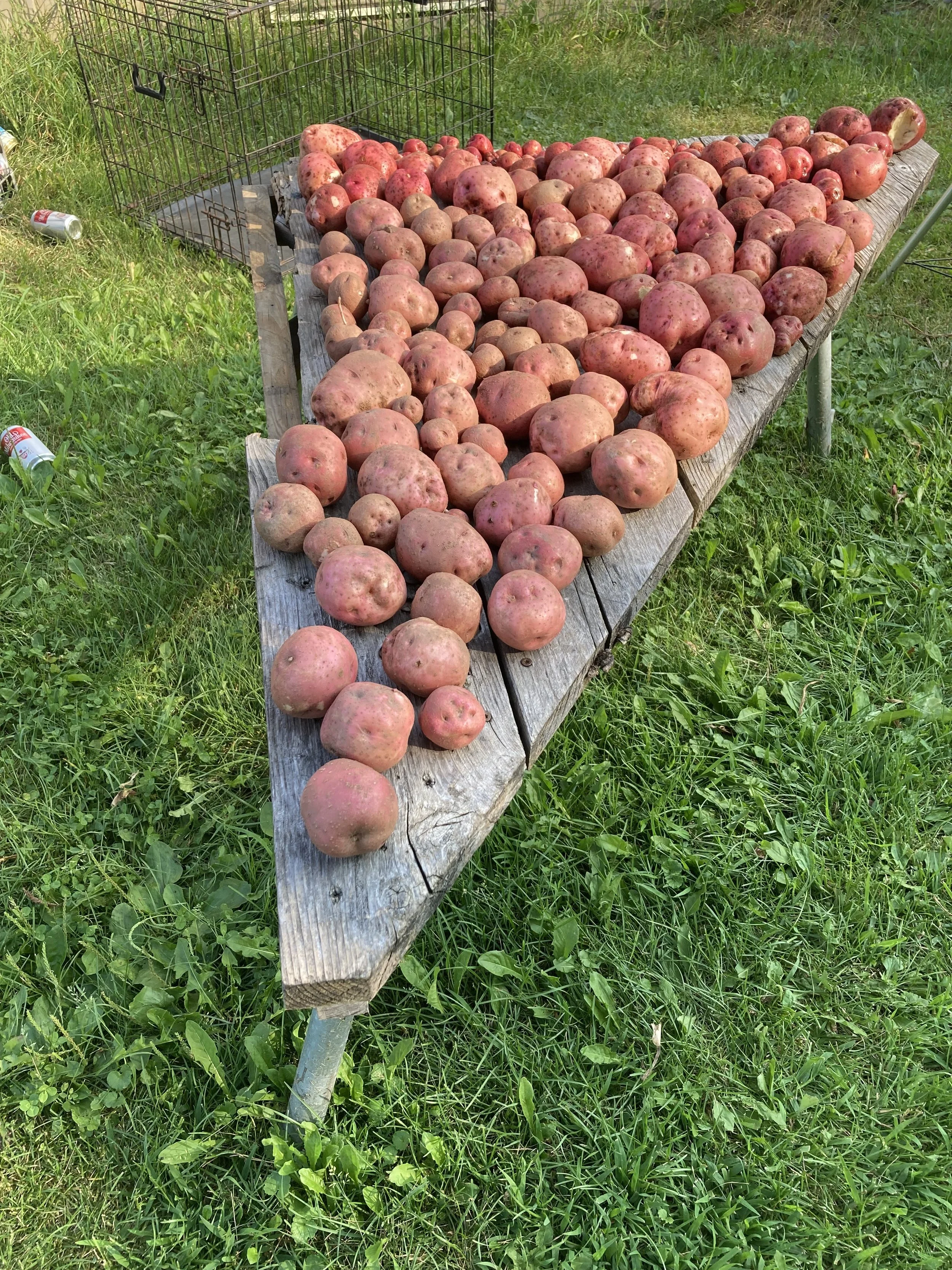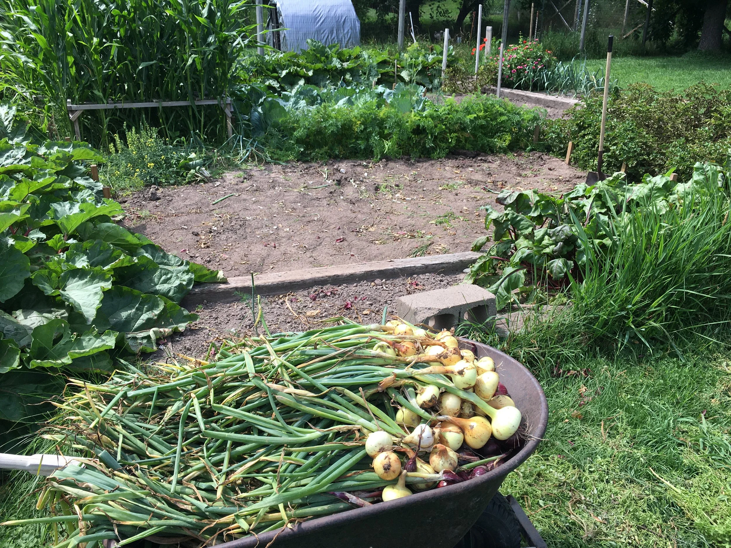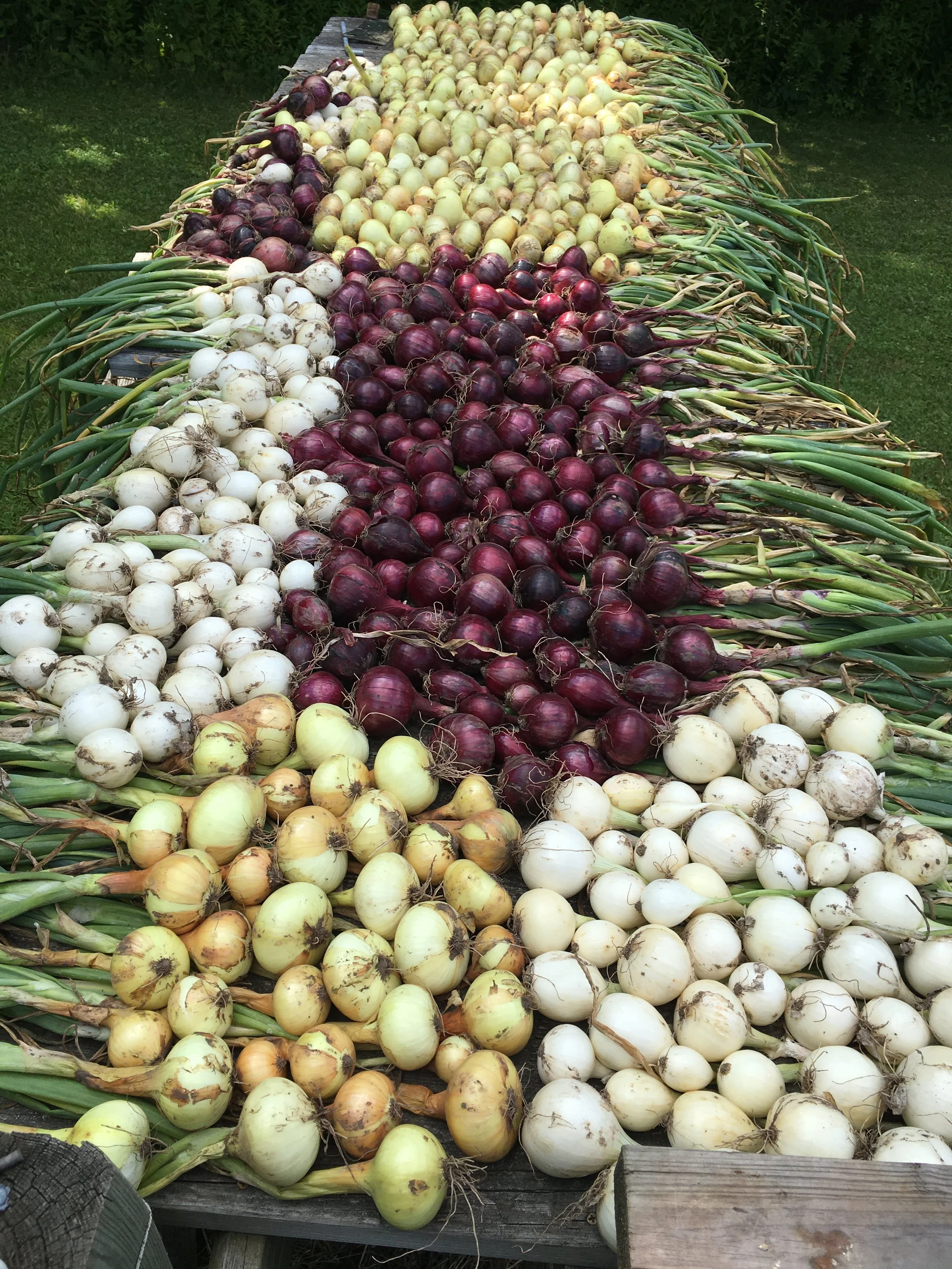 We grow four varieties of garlic: two hard neck and two soft neck. The “neck” refers to the stems. These are River Giant, and they loved the weather this year! Only a few tried to bolt (creating a hard neck in a soft neck variety), so I was able to braid them easily. I will bundle the hard necks. All will go down into the basement, where it is dry, cool, and dark. We are just finishing off last year’s garlic, which means we planted enough, but not too much. The soft necks tend to last longer than the hard neck varieties, as the paper around each clove clings tighter, protecting them from dehydration.