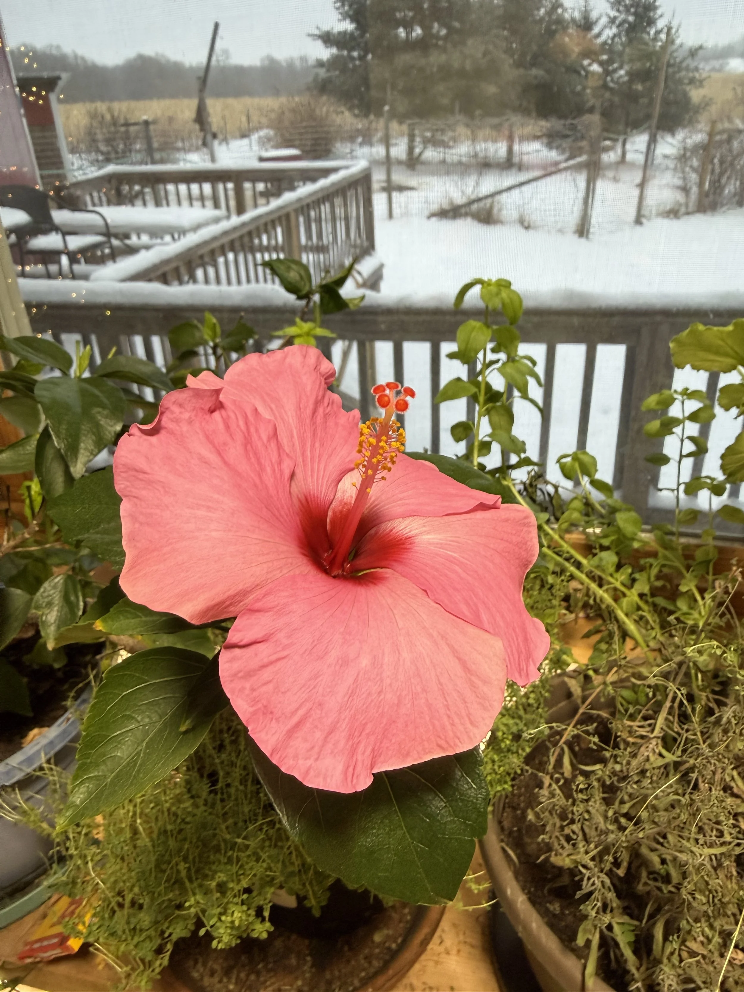 Michael makes sure I have a hibiscus in the house. I fell in love with them in Brazil, where they would spill over from peoples’ yards into the sidewalks. I now live with snow and cold, but my life if full of flowers.