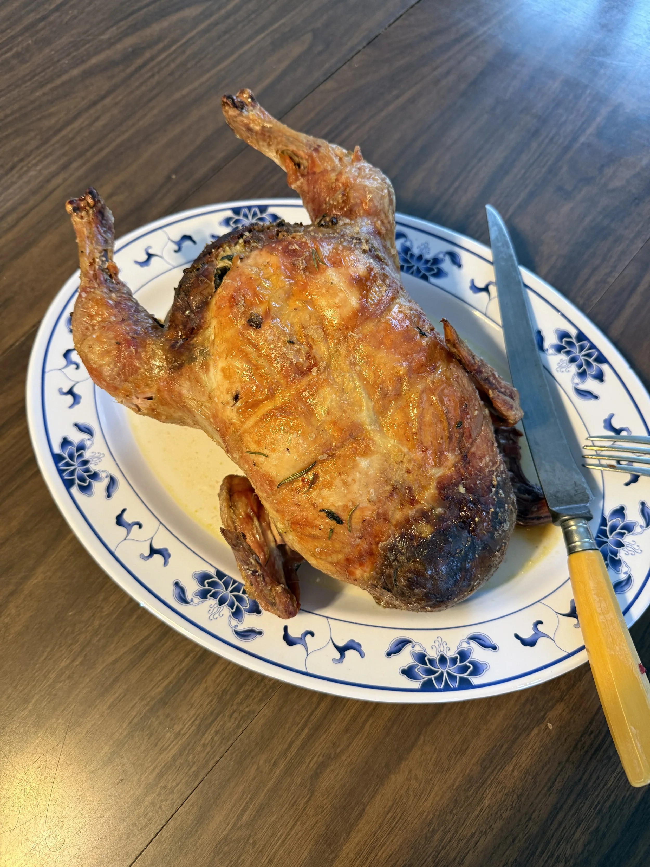But only by taking out a chicken to roast. Michael makes the best stuffing. This version had the traditional onions and celery, to which he added collards, mushrooms, black olives, jalapeños, and baby corn. He loves bread. He knows I love vegetables. His dressing reaches new heights of culinary delight through his efforts to meld our preferences together.