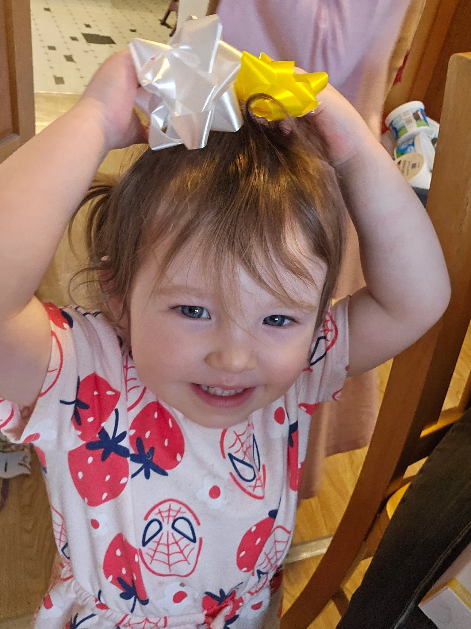 It seems that Boopa left out his toe-care cream and clear nail polish, which GG#2 used to give the GrandGuy an updo. She had far less “product” in her hair. Both were bathed but the GGuy needed to be shorn. Another memorable celebration for future tales to intendeds!