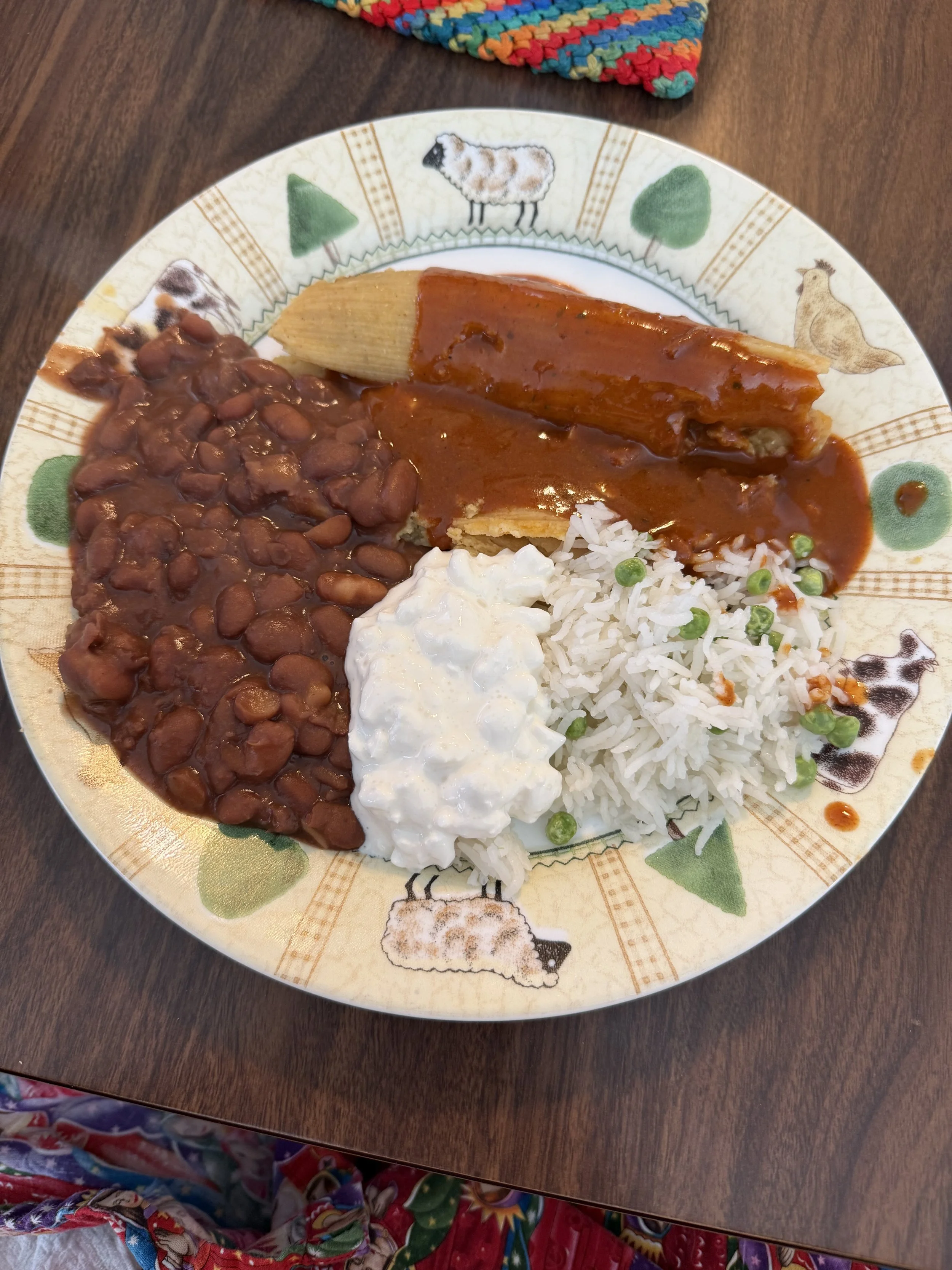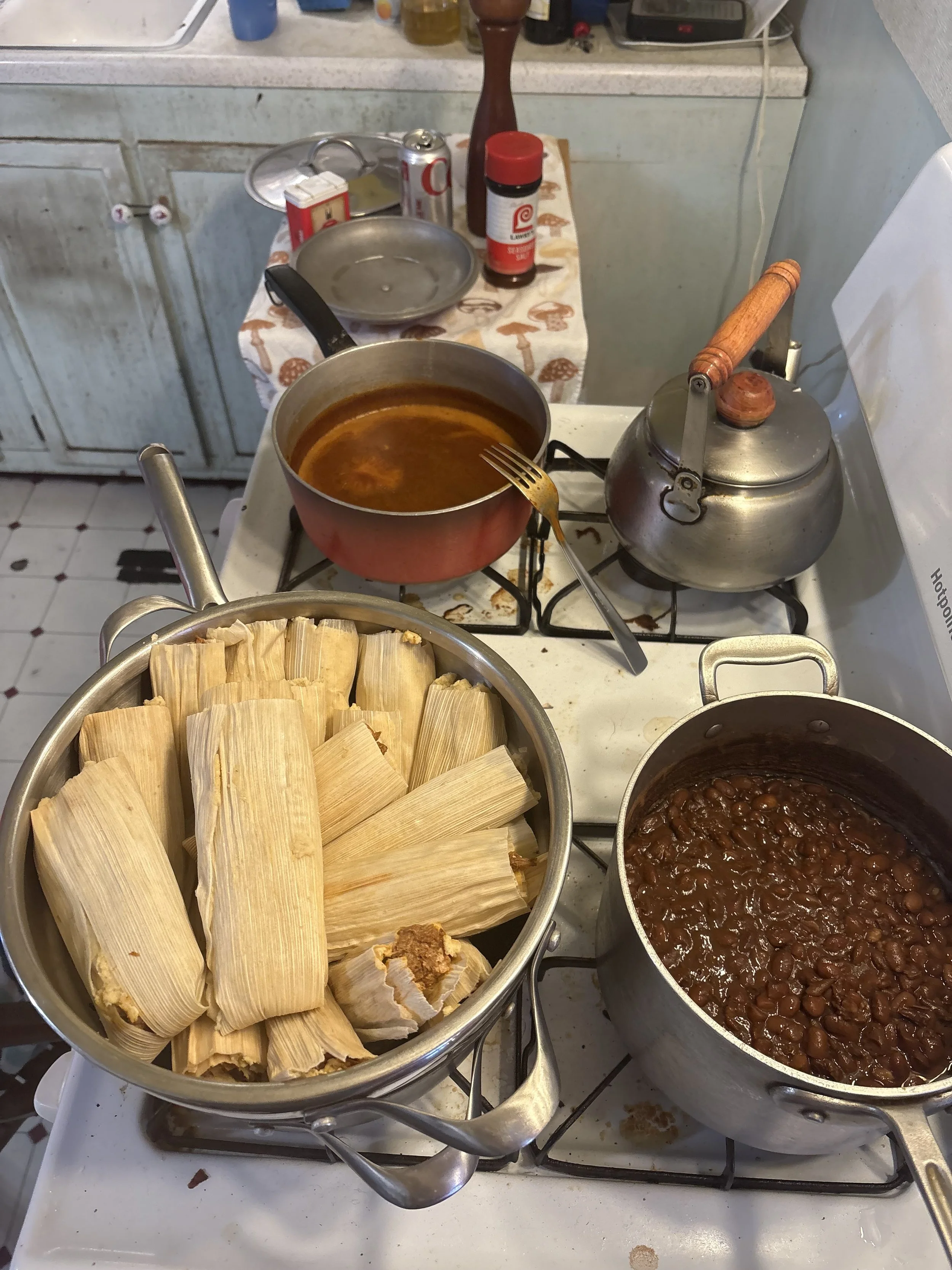 The tamales steam for an hour. Michael made beans, rice, and red chile to round out the meal.