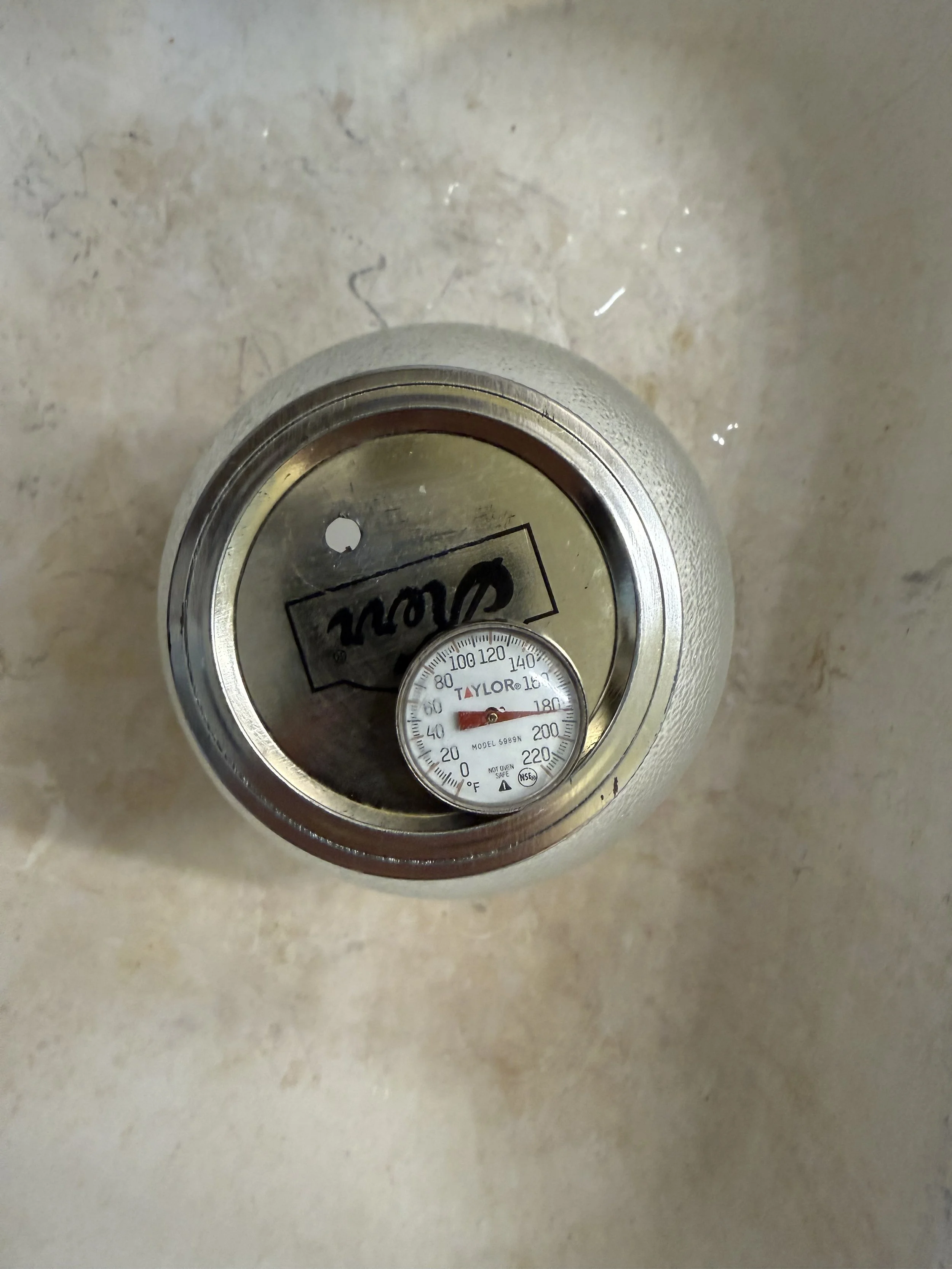 The water, which started at room temperature, clocks in at 185° almost instantly. (We do stir it with a wooden spoon handle to dissolve all the lye).
