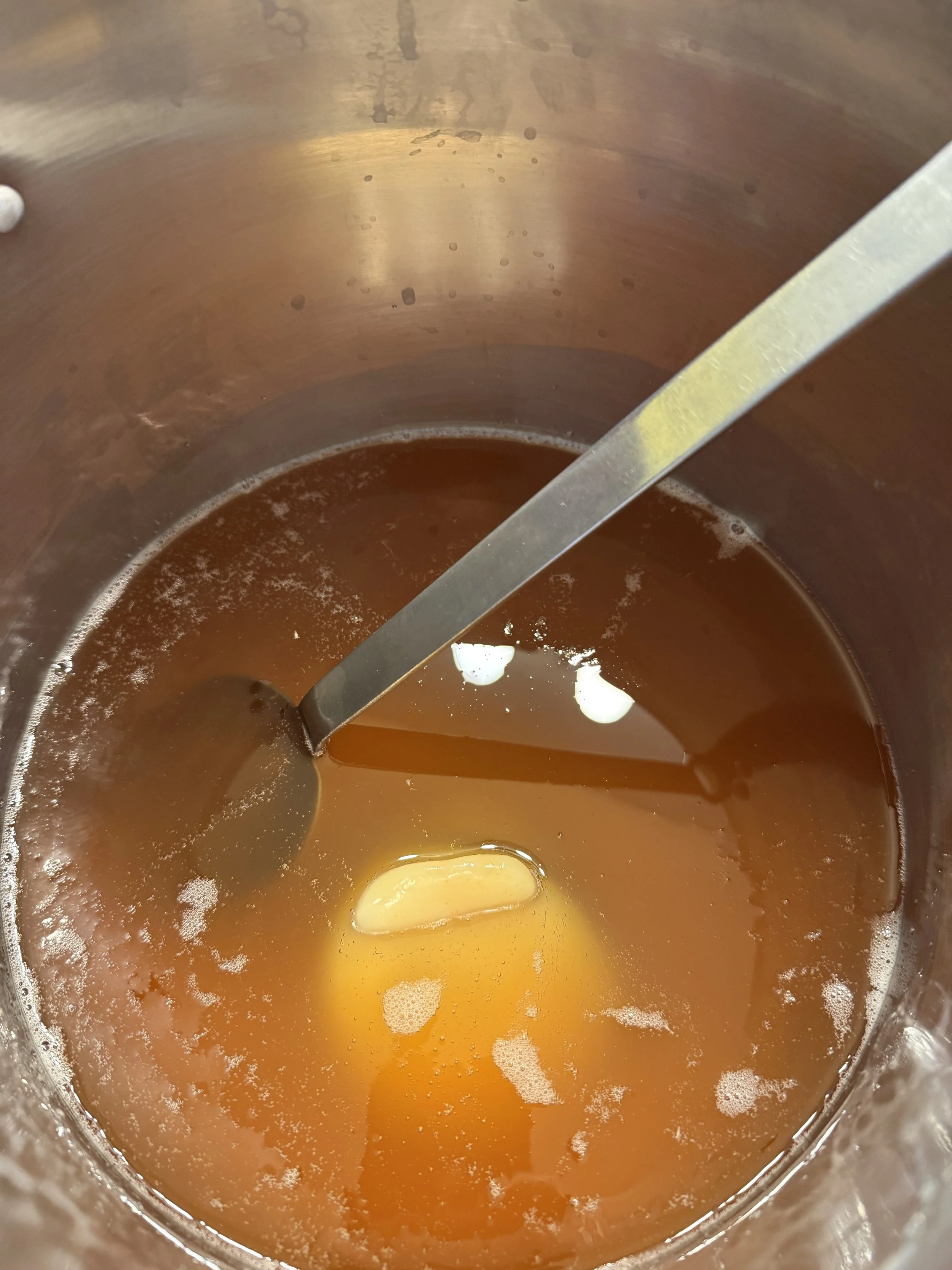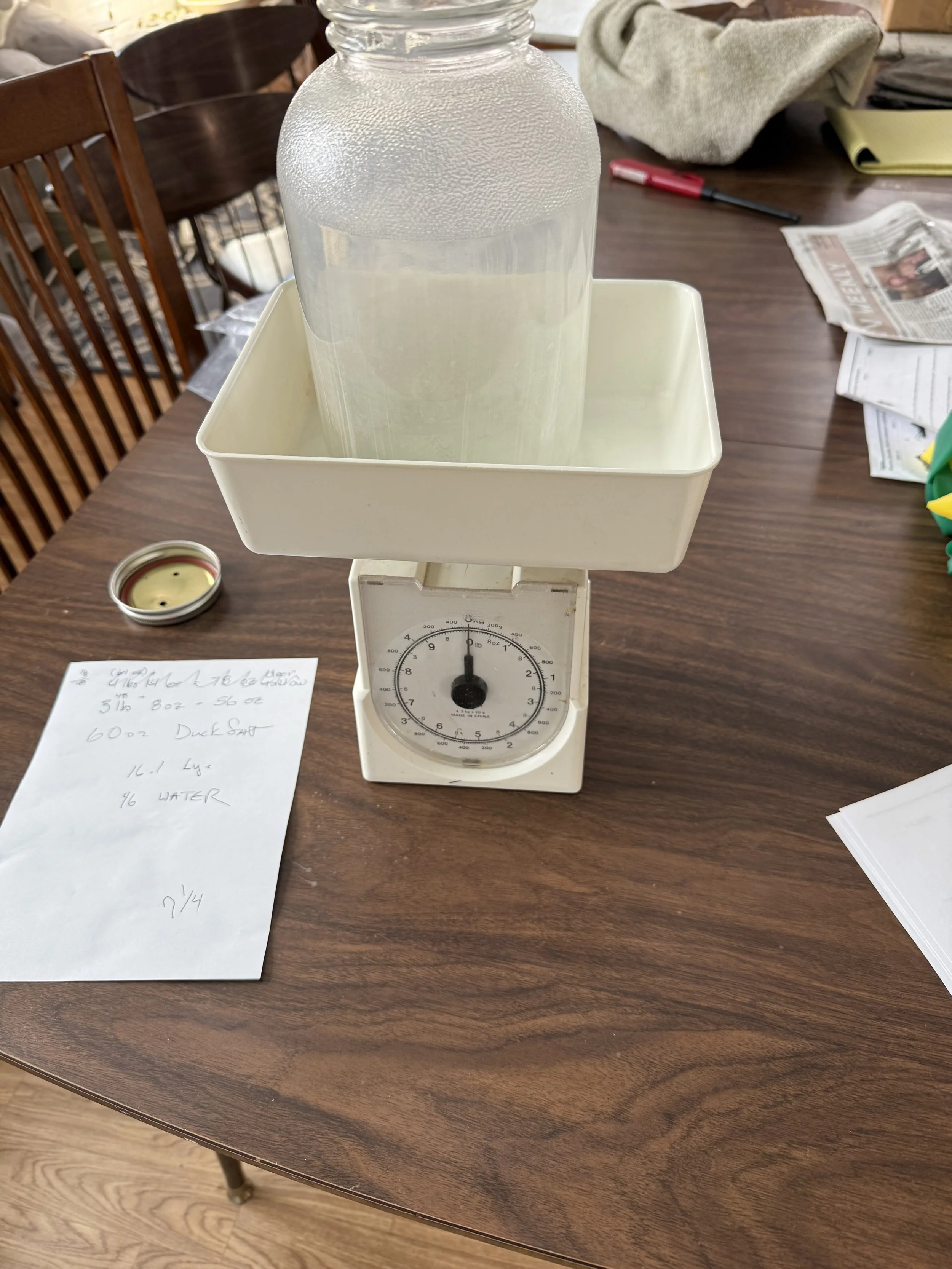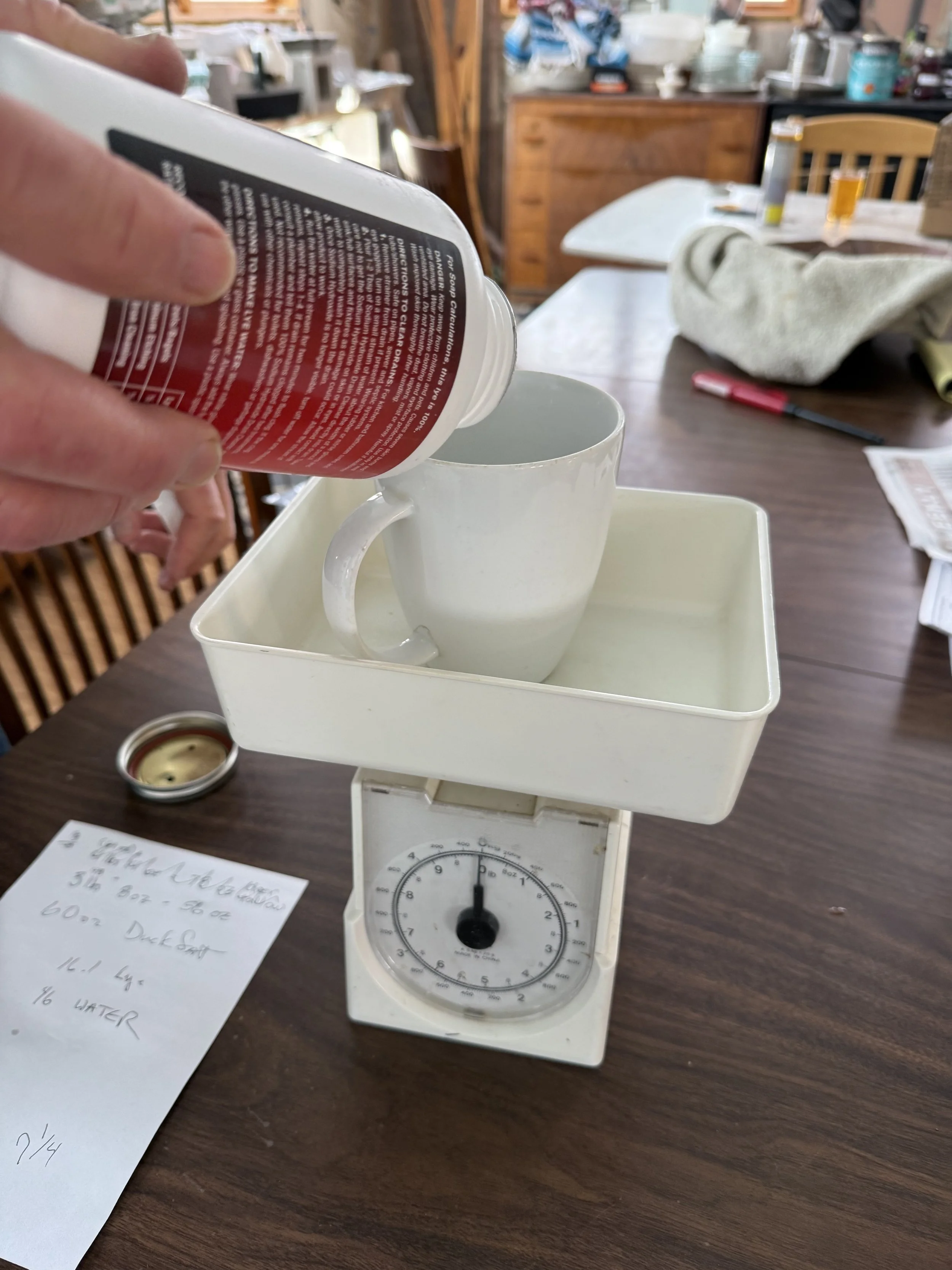 The process starts with measuring. The weight of the fats are entered into a soap calculator to give the amounts of water and lye needed. We zero the scale for every vessel, which is called “taring.”
