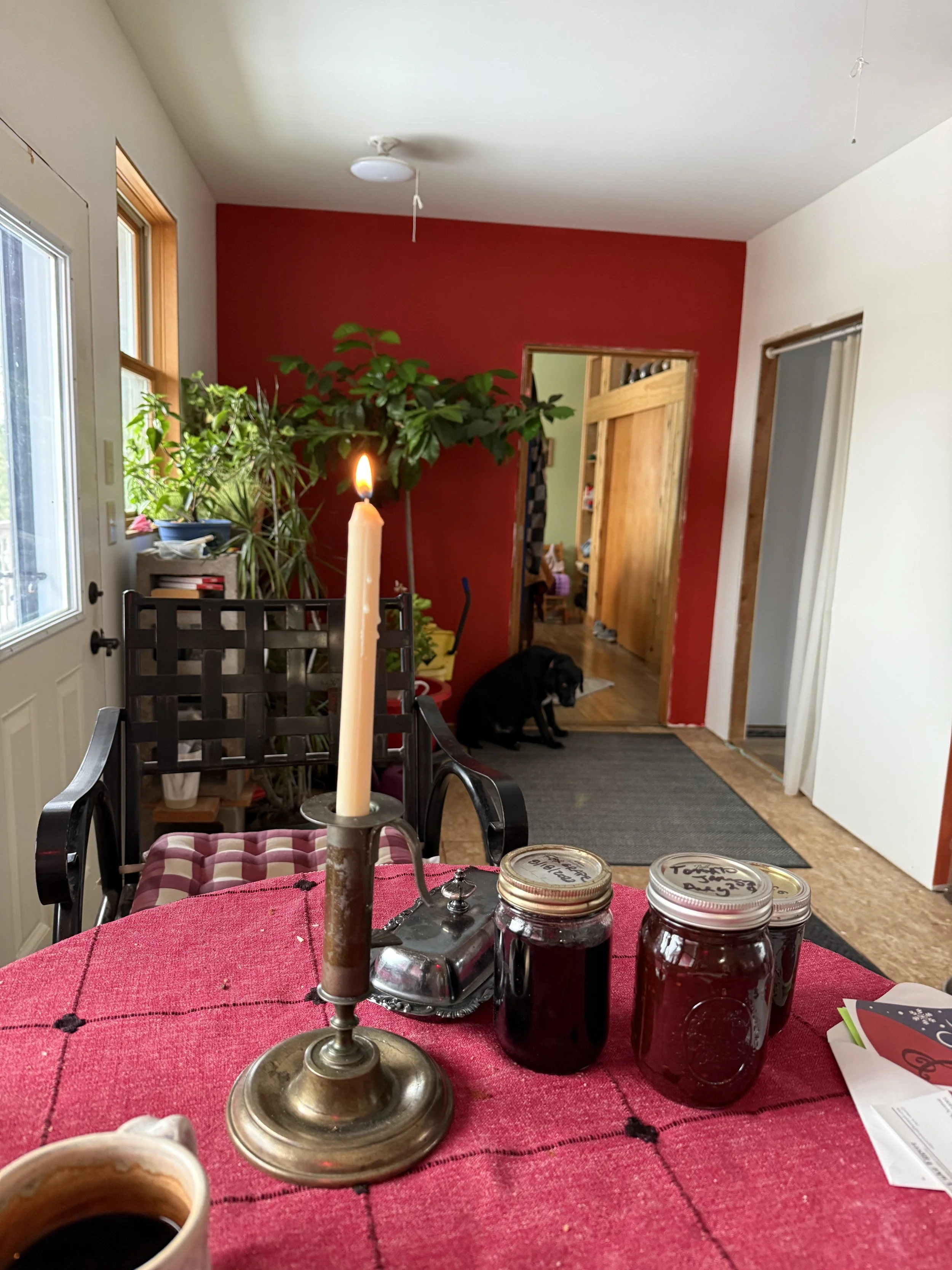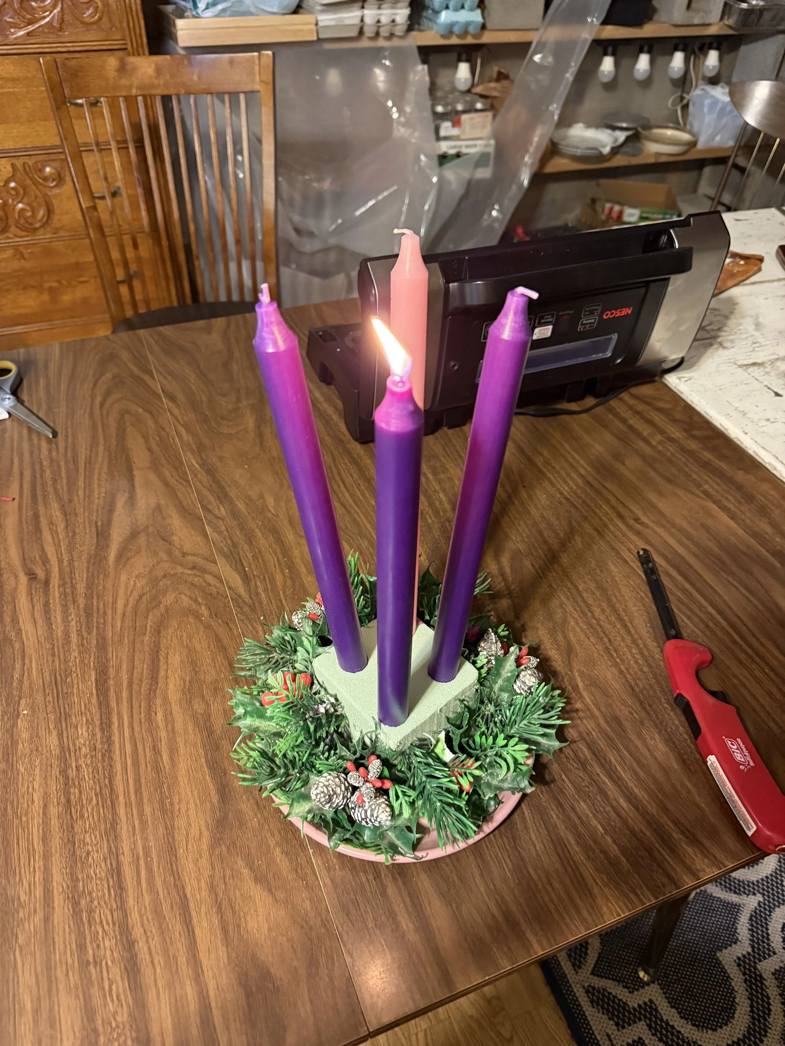 Michael is not a fan of formal religion, but accepts certain rituals, such as having an Advent Wreath, as these are ways of marking time, keeping Christian holidays from being solely a commercial enterprise. I mean, I did buy the candles. We are gathering tools to make deer tallow candles, but have had delays in sourcing candle wick. Hanukkah, Kwanza, Diwali, all involve light in dark times.
