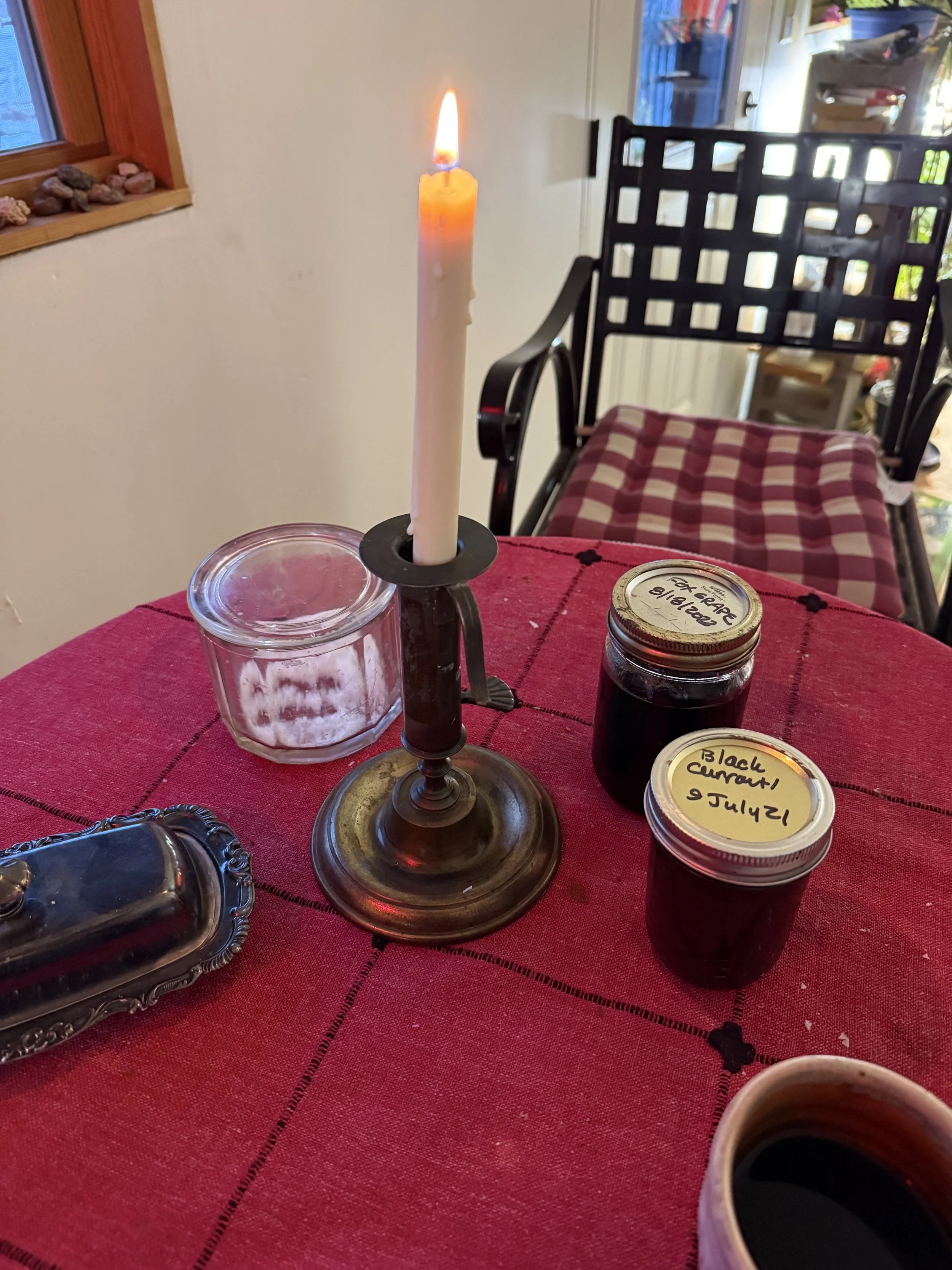 The chicken, potatoes and applesauce came from our gardens, as well as the rhubarb wine. The china was Michael’s grandmother’s, which makes it five generations who have used this set, if you include the grands.