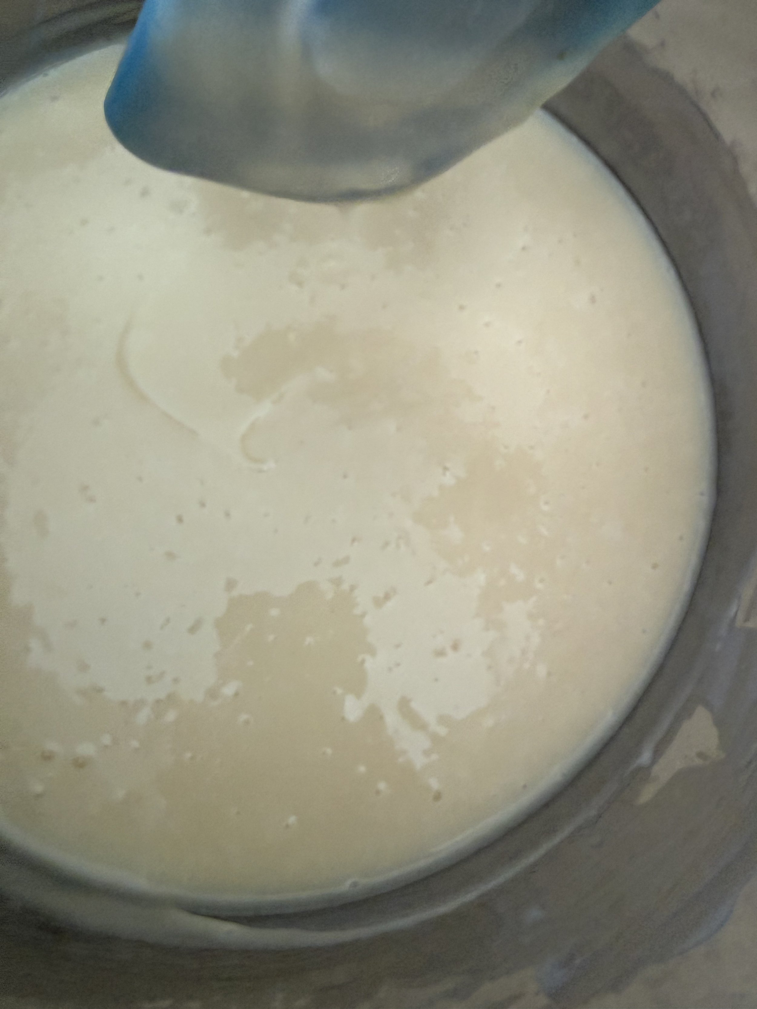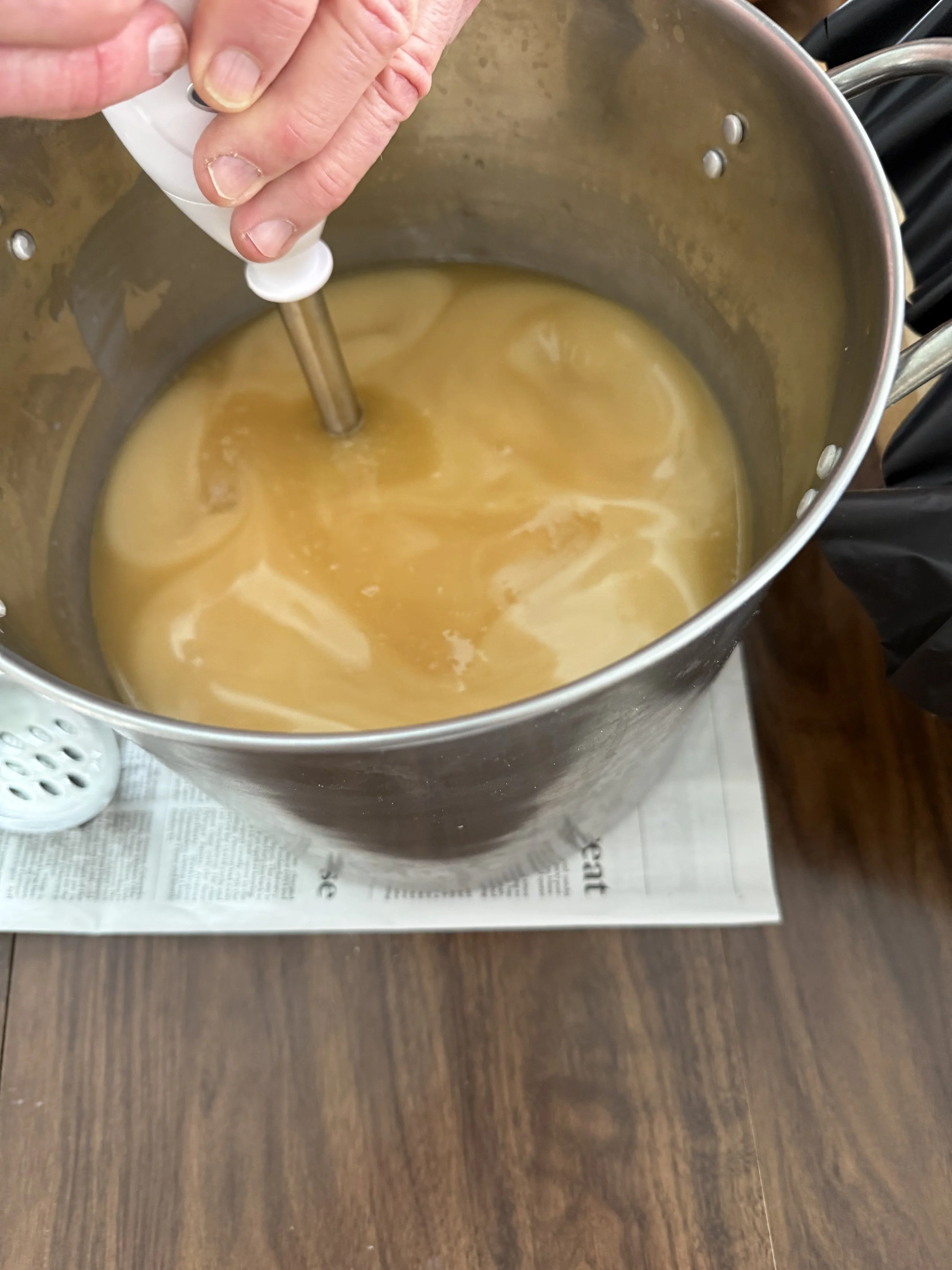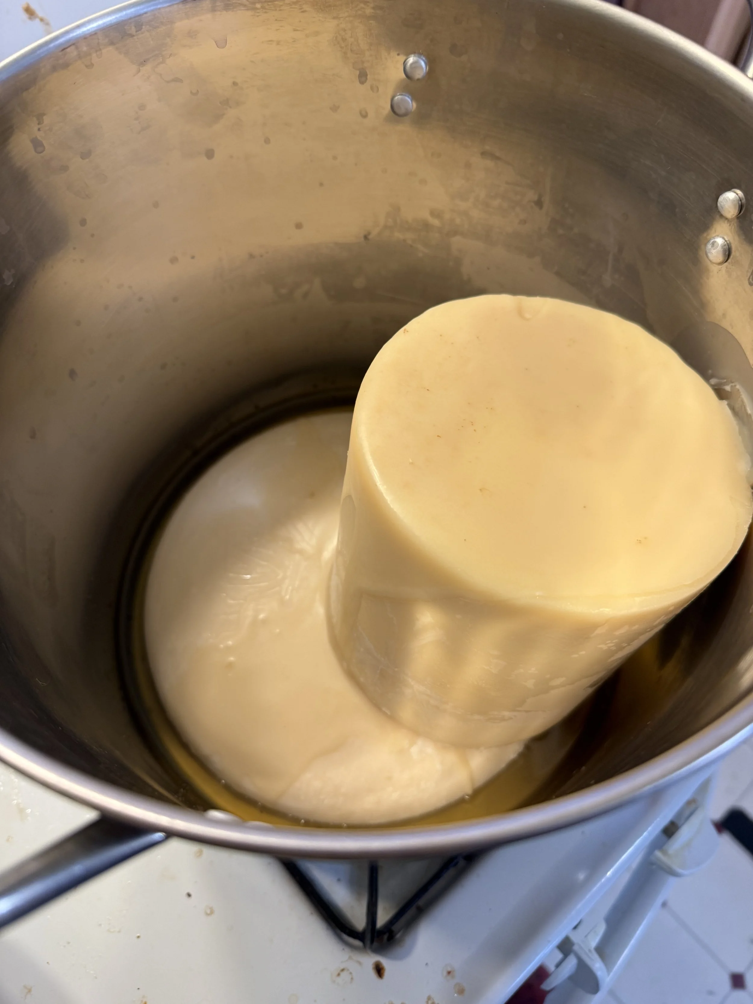 The lye solution works on the fats in a process called saponification, a fancy word meaning “turning into soap.” The trick is getting a combination that solidifies into a bar pleasant to use. The color change says the process works. The blending continues until the mixture thickens and “traces”, or leaves a visible mark on the surface.