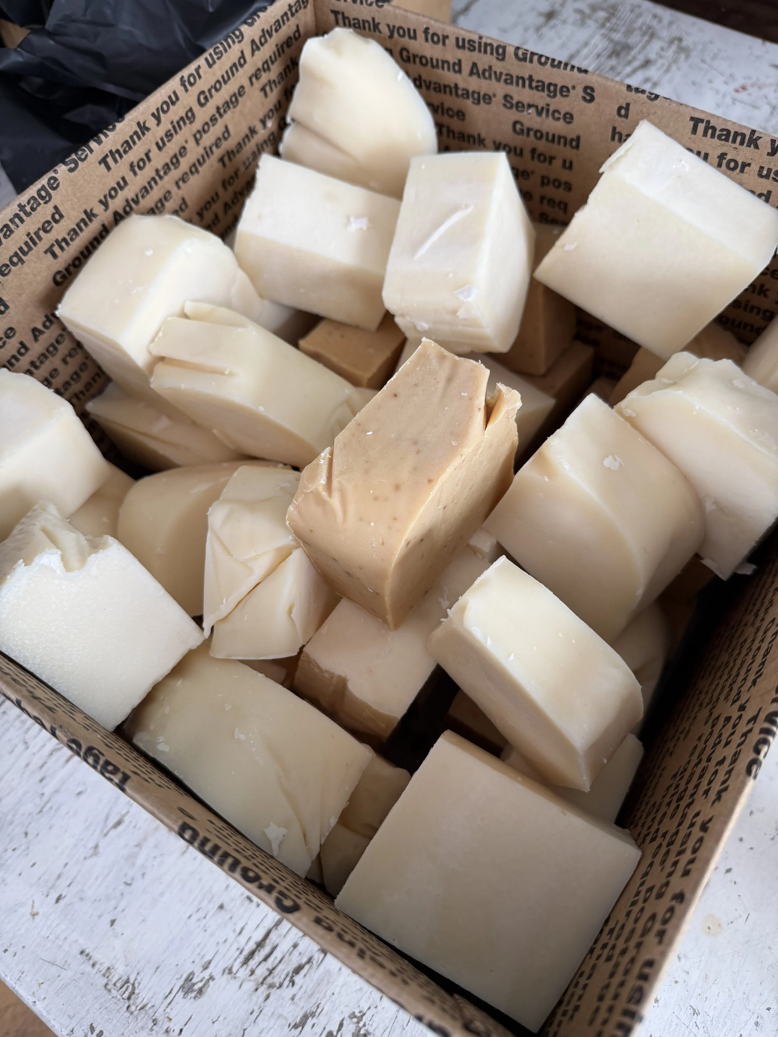 This is end-product soap. That darker soap is the goose-deer mix. It smells lemony, whereas the duck-deer smells more like milk chocolate. Pure deer tallow makes a bar so hard and sharp Michael says you can shave with it.