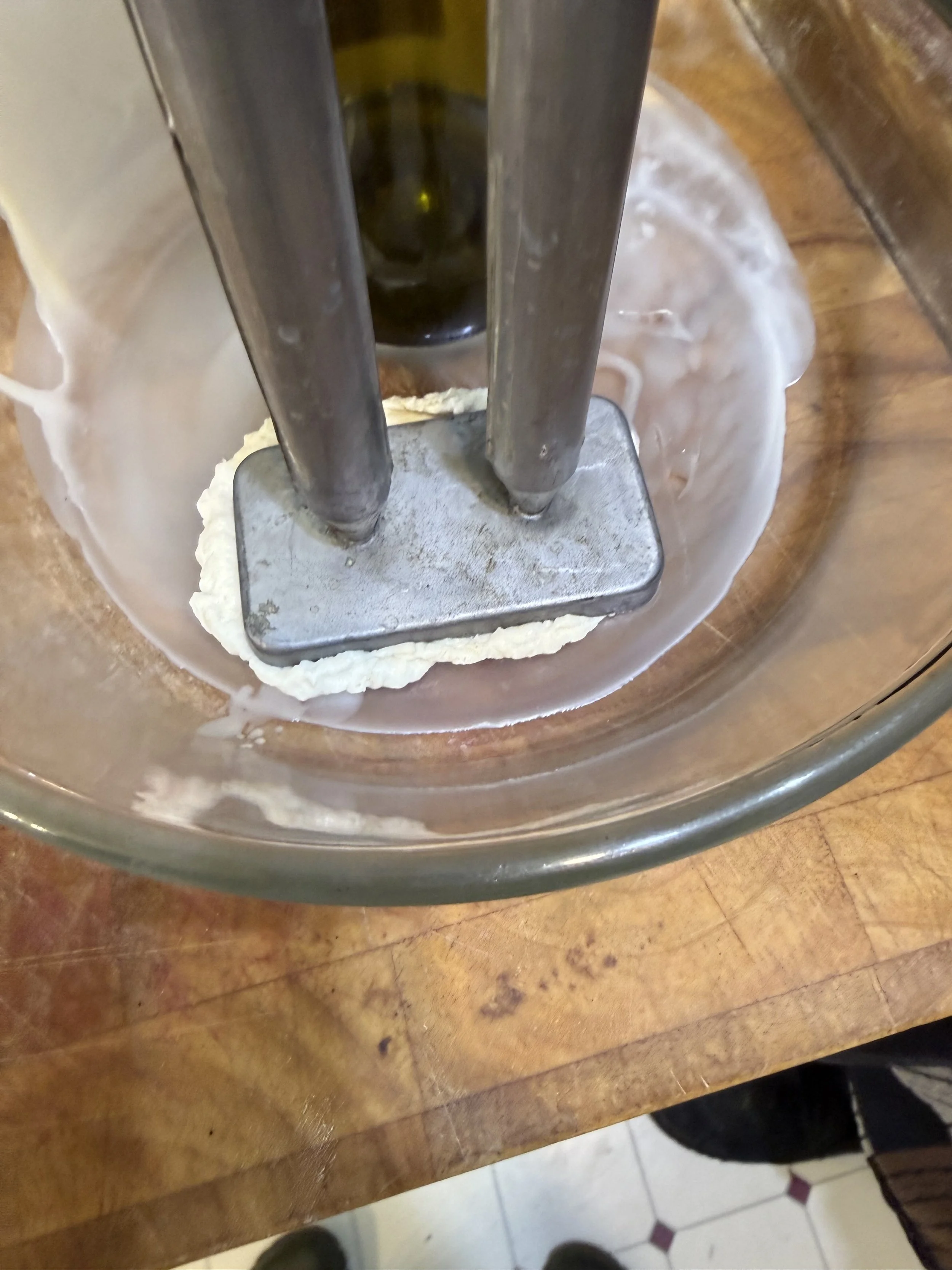 Once the tallow melted, I filled the mold. It leaked immediately. The tape fell off. Michael made a paste of flour and water to act as a stopper. This only worked so well, as I had to apply steady downward pressure to keep this from leaking. Michael got a large lead weight, which applied sufficient pressure, but was hard to balance. The whole thing fell over, splashing deer tallow everywhere. We started again, and this time while I held a steady downward pressure, Michael rubbed the outside of the mold with an ice cube. This worked! The tallow solidified with minimal leakage.