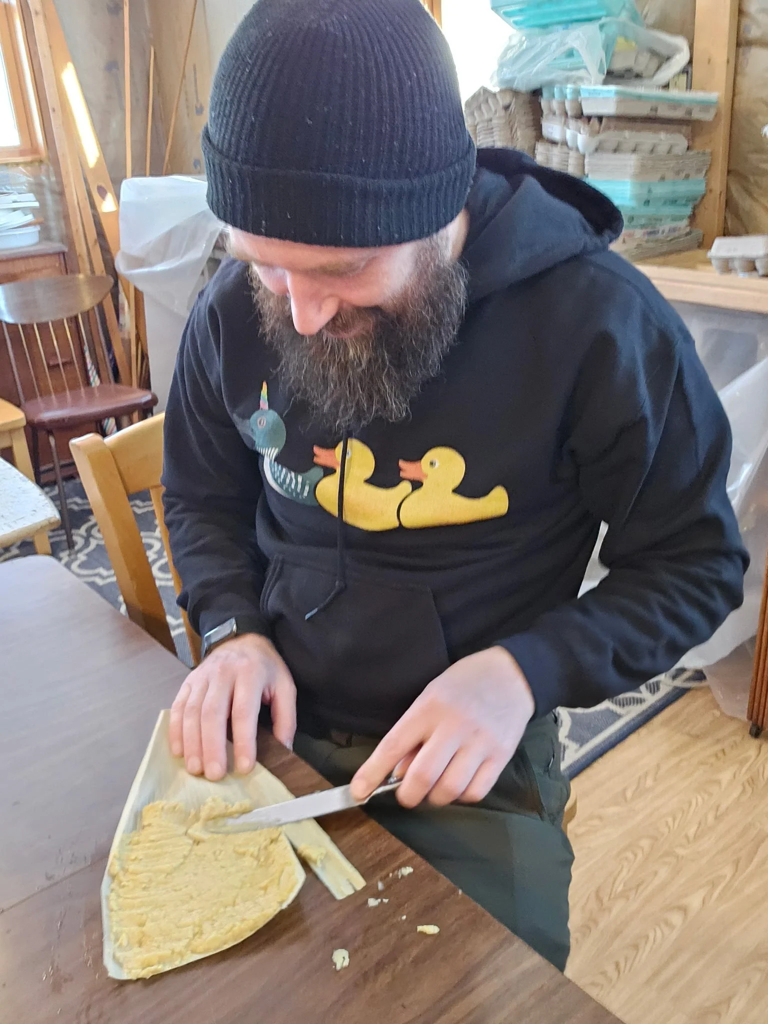 In an effort to free some freezer space (we still have 15 ducks that need to go before winter sets in), I rendered three pounds of duck skin. We have large blocks of deer tallow in the freezer that need to be turned into soap. But deer tallow likes to be cut with a softer fat to make good soap. The deer-duck mix is my favorite, not only for texture, but somehow it turns out smelling like milk chocolate. We gobbled down the cracklings and I froze the 3 cups of duck fat.