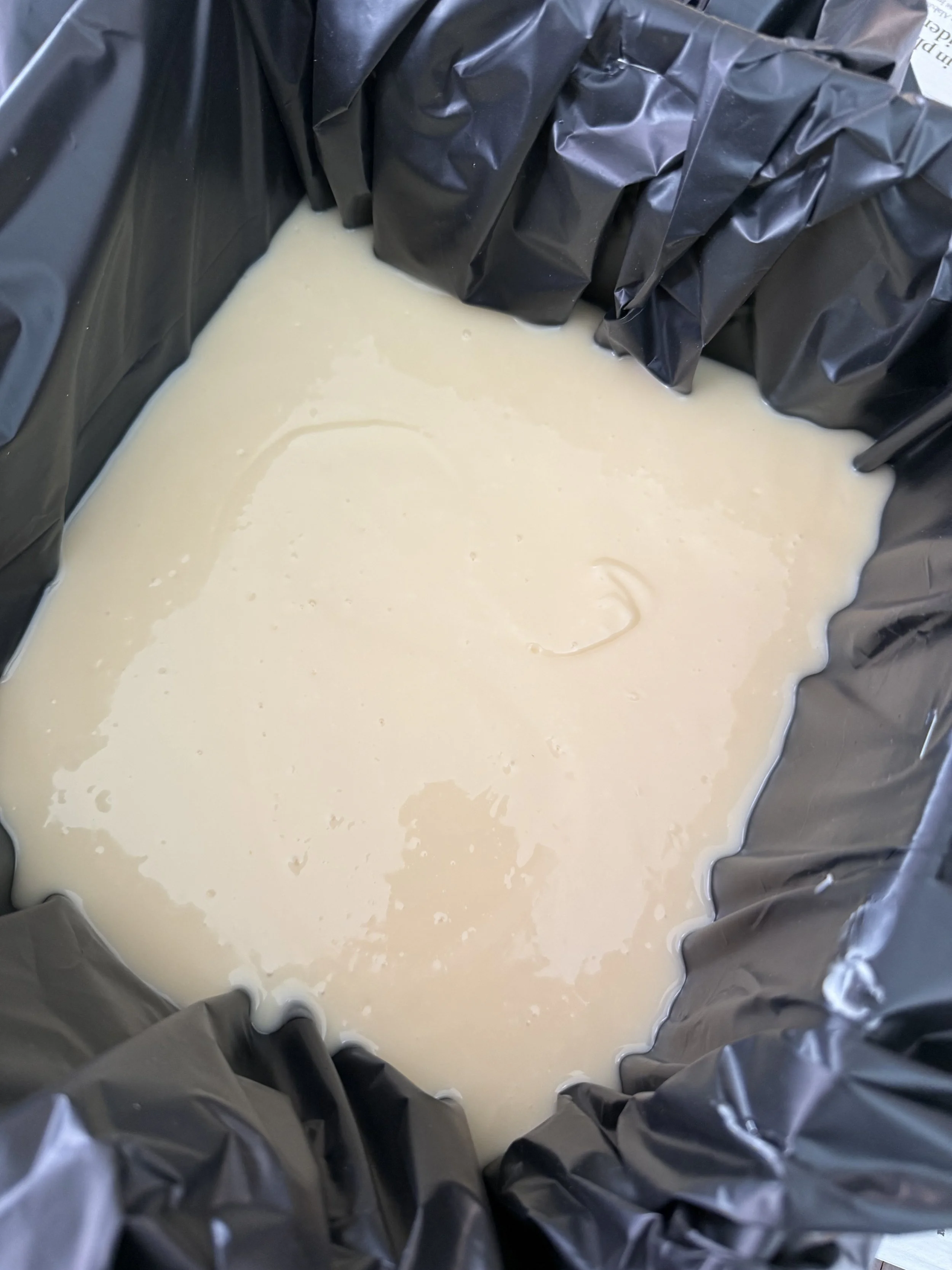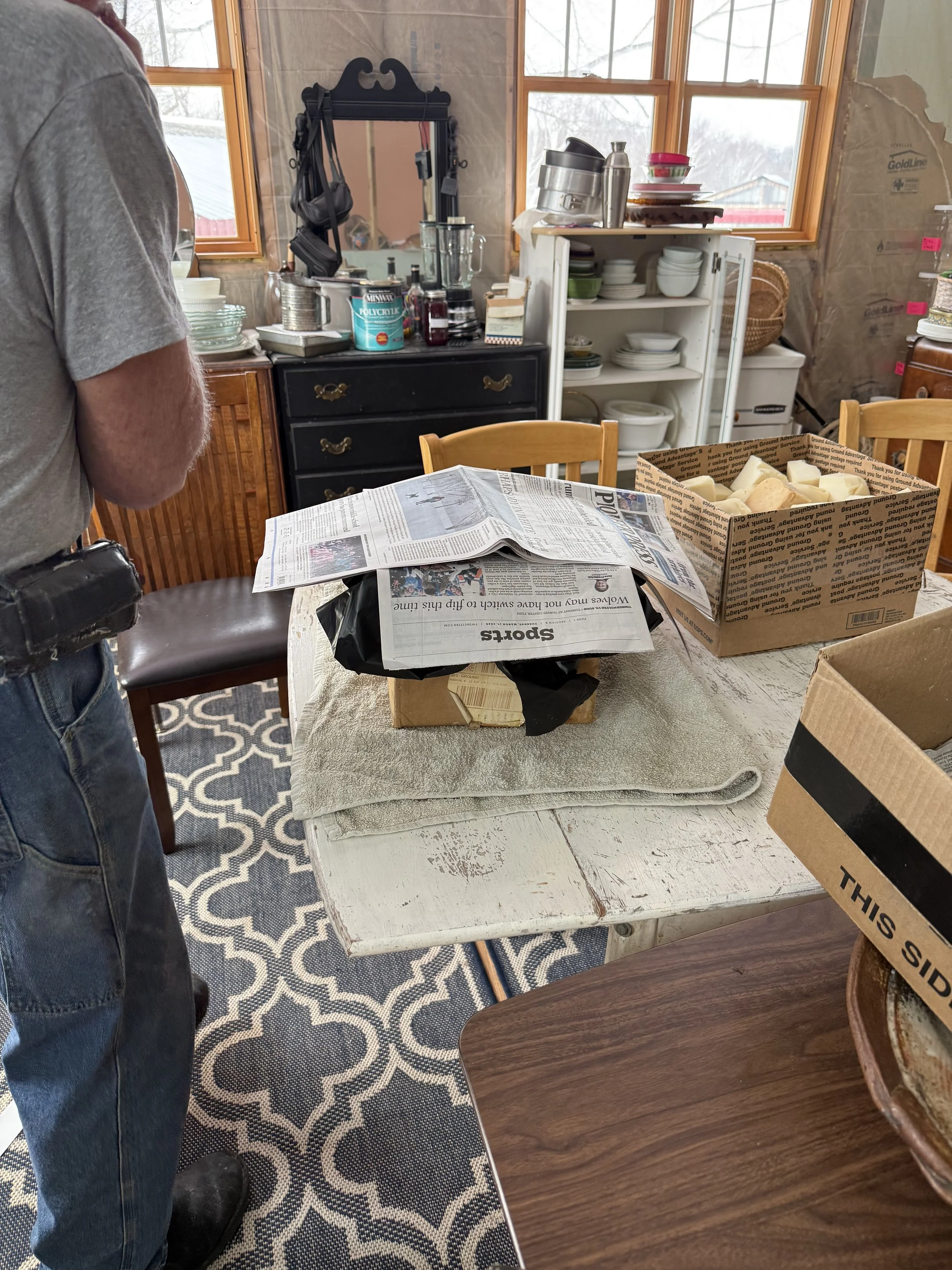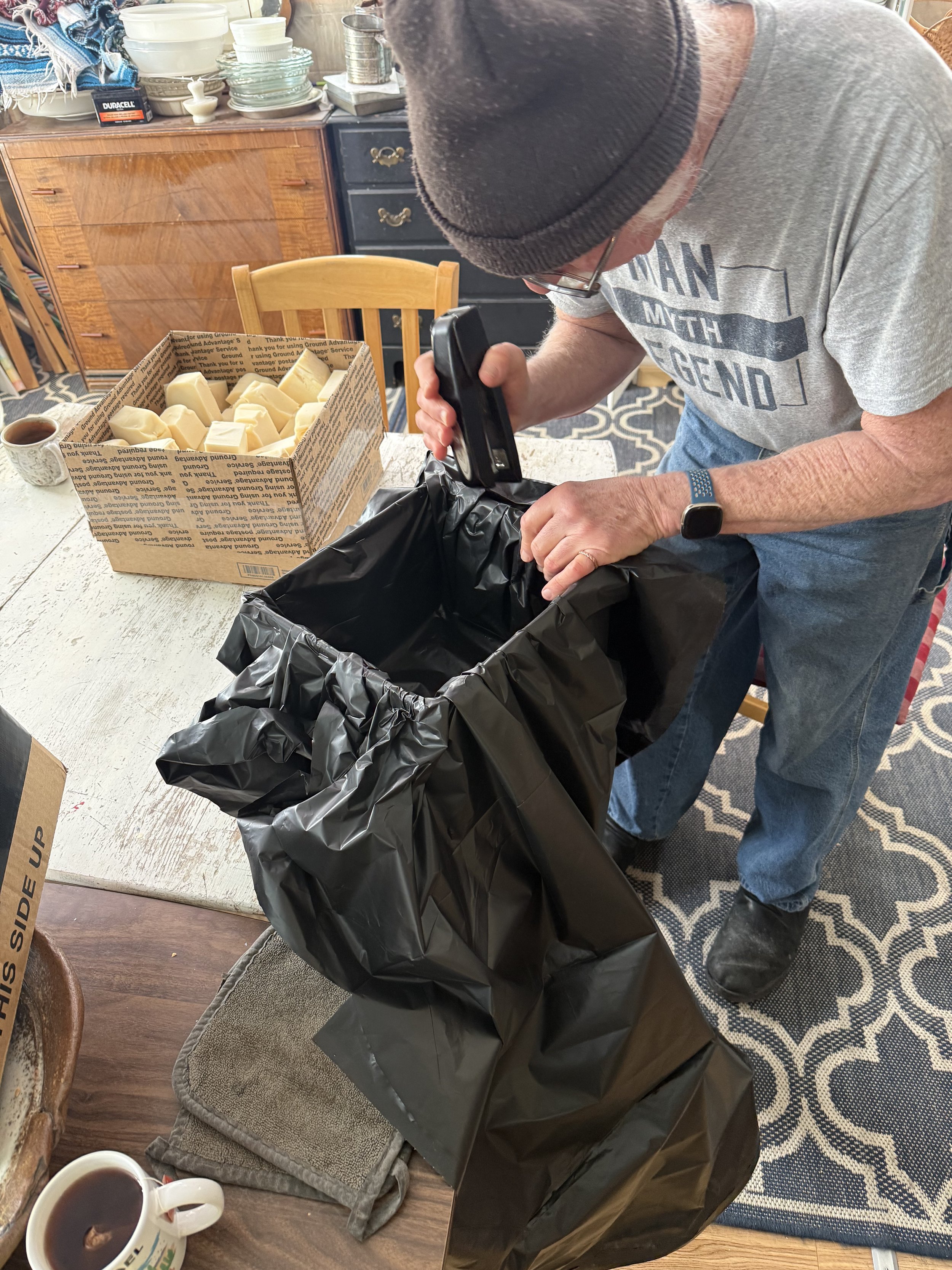 While the fat and lye solution cool to 100°F, Michael lines a cardboard box with plastic. We use construction grade garbage bags.