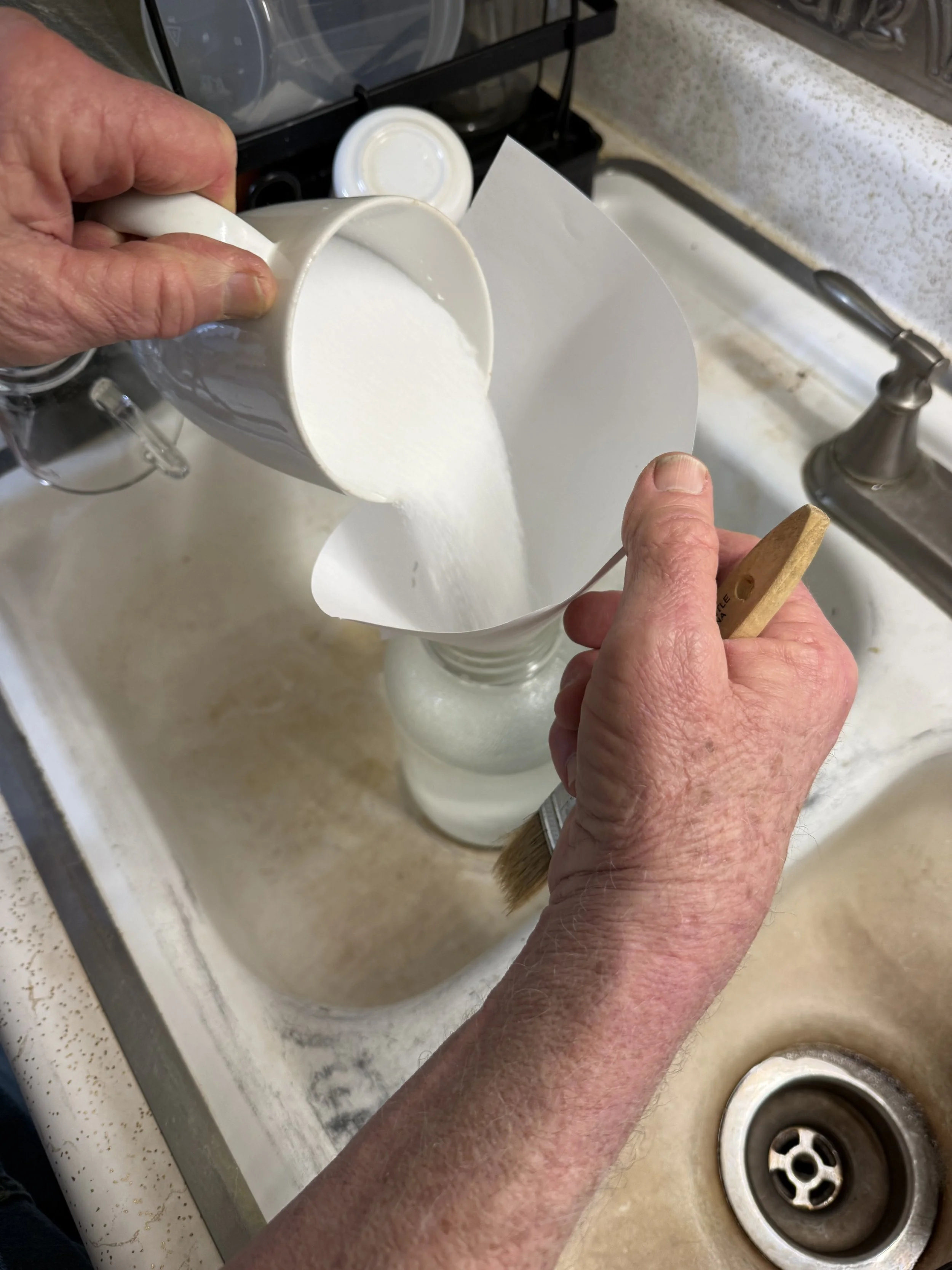Michael carefully adds the lye to the water, which creates an exothermic reaction. If he added the water to the lye, it would work on less water, creating a steam flash, which could create an explosion or would at least shatter the bottle. Bad idea. “Do as you oughta, add acid to watah,” admonishes every chem teacher ever. Same goes for strong bases, such as lye.