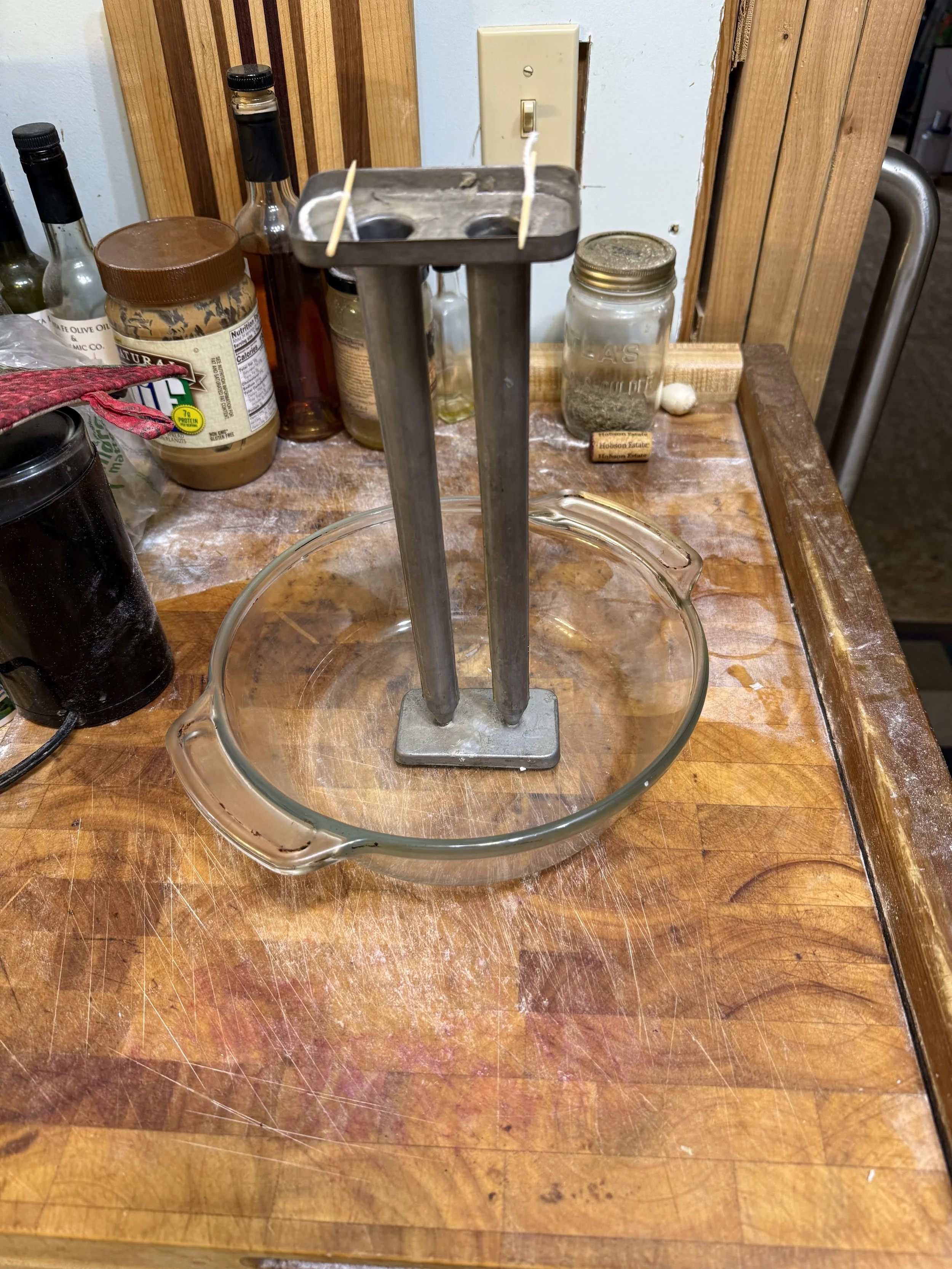 This is the candle mold. Michael said to tape the bottom holes, where the wicks come through, shut. Not trusting an unproven method, I used a deep dish for possible leeks. I threaded toothpicks through the wick to hold them at the top.