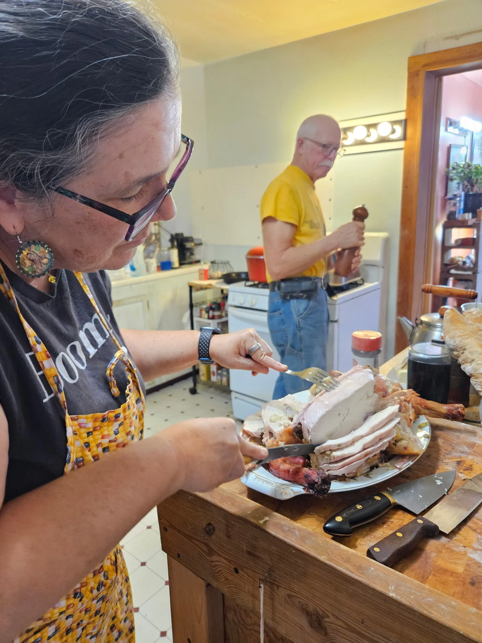 That is one of our 10 lb. broilers I am carving. It fed 10 of us, with leftovers. Michael is making gravy in the background…which also requires copious amounts of black pepper.