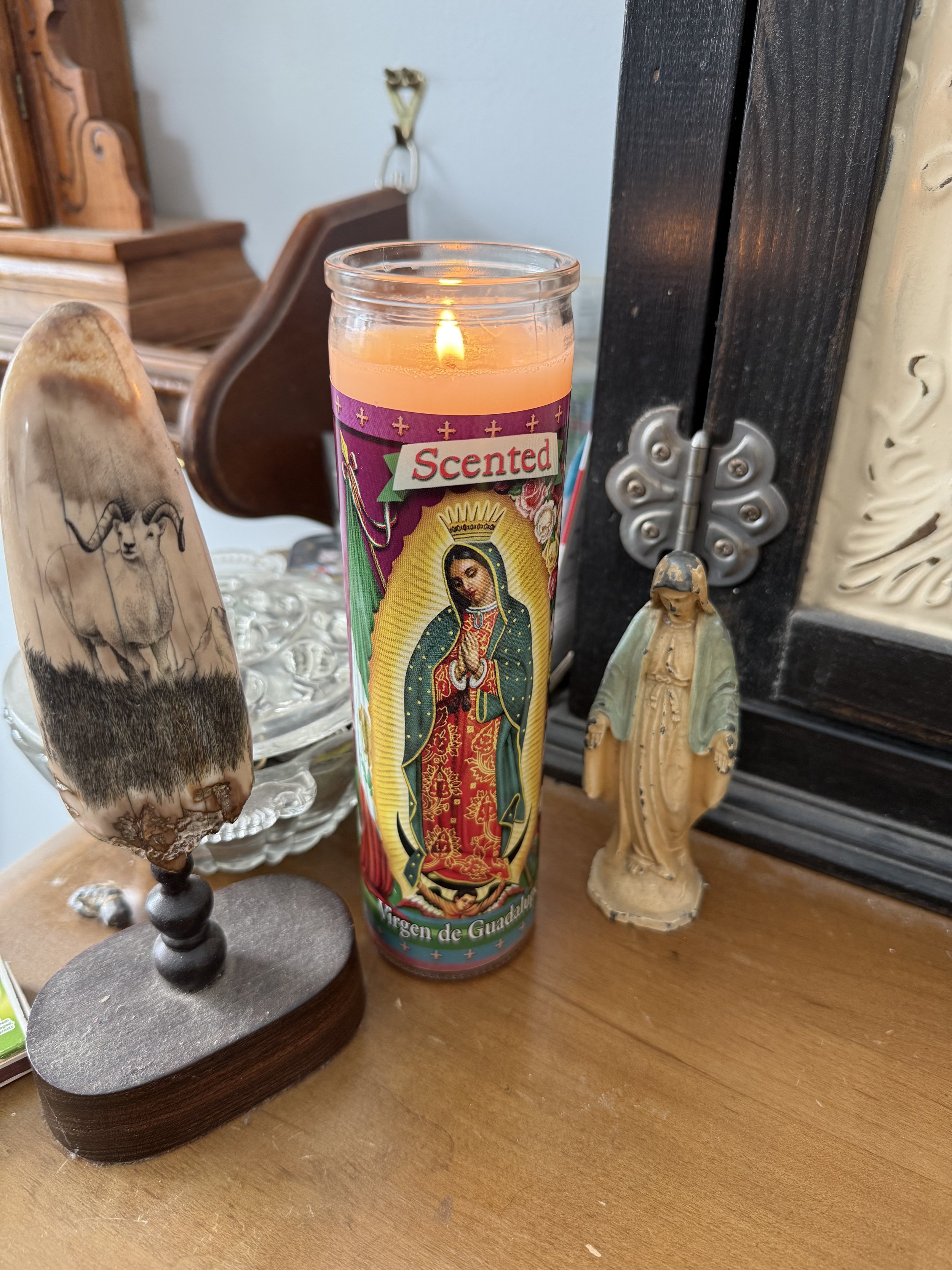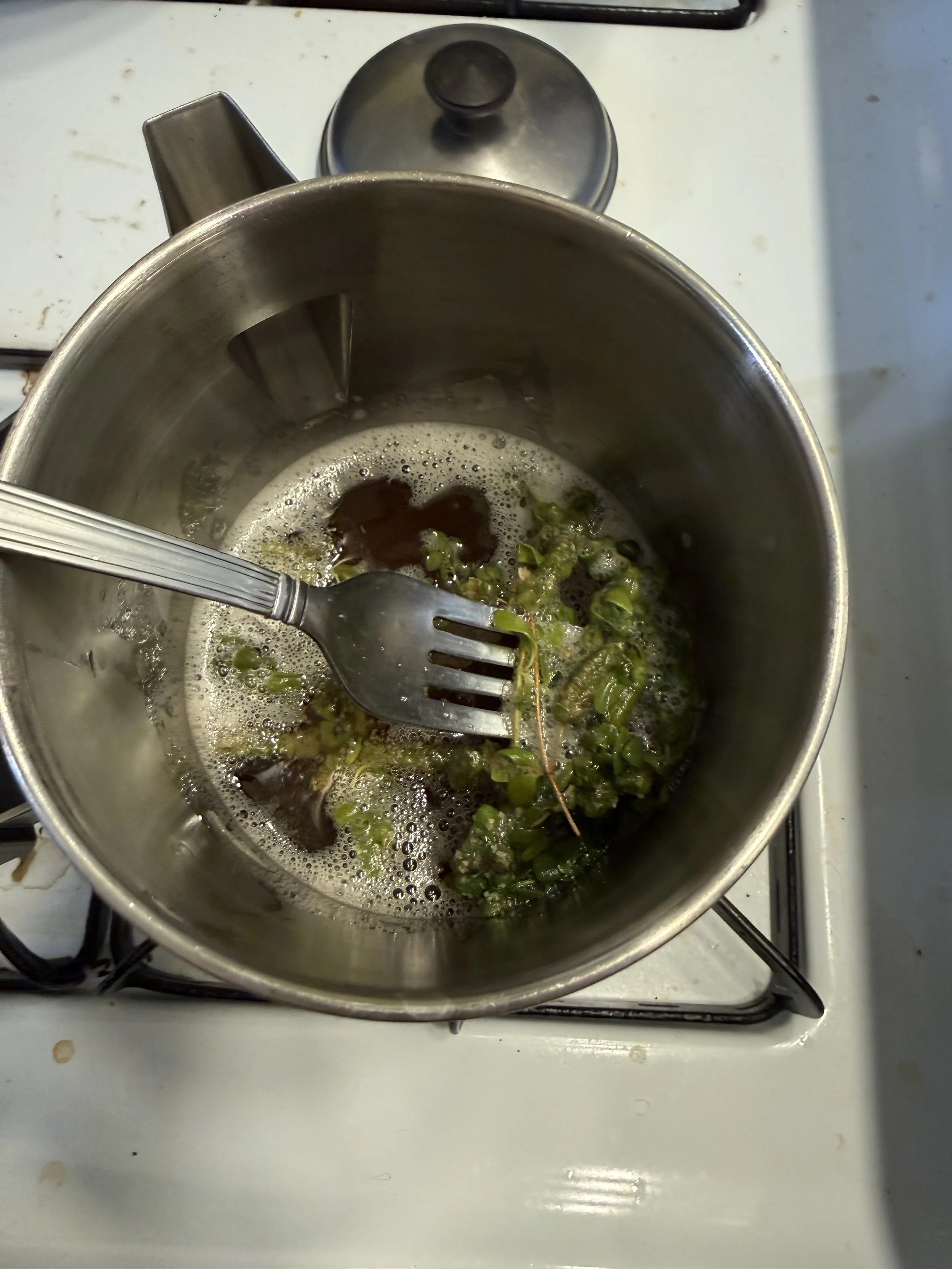 I melt my tallow. Lately I’ve added herbs as it melts. I remove the herbs. I pour. I wait. I trim the wick. It burns.