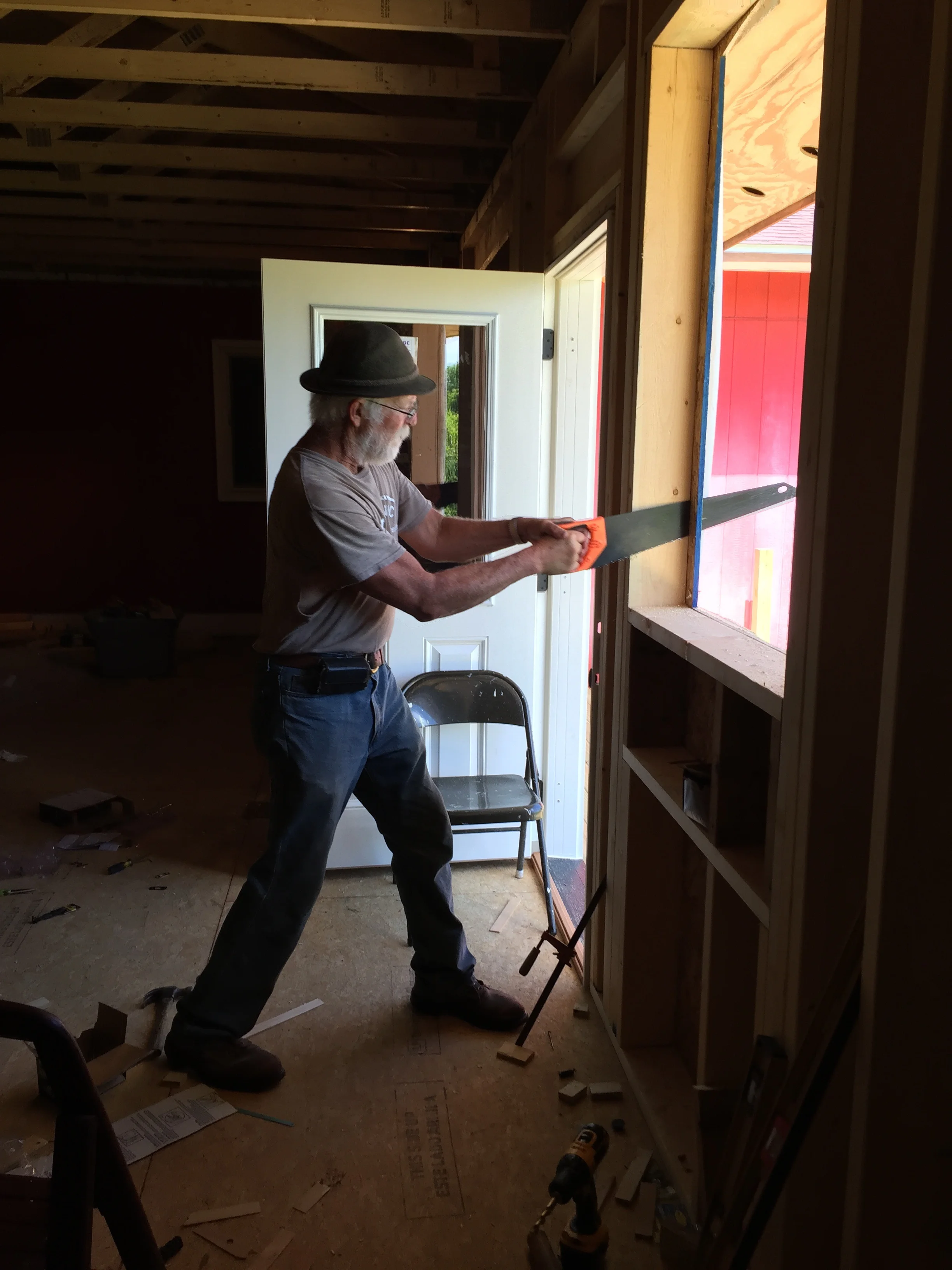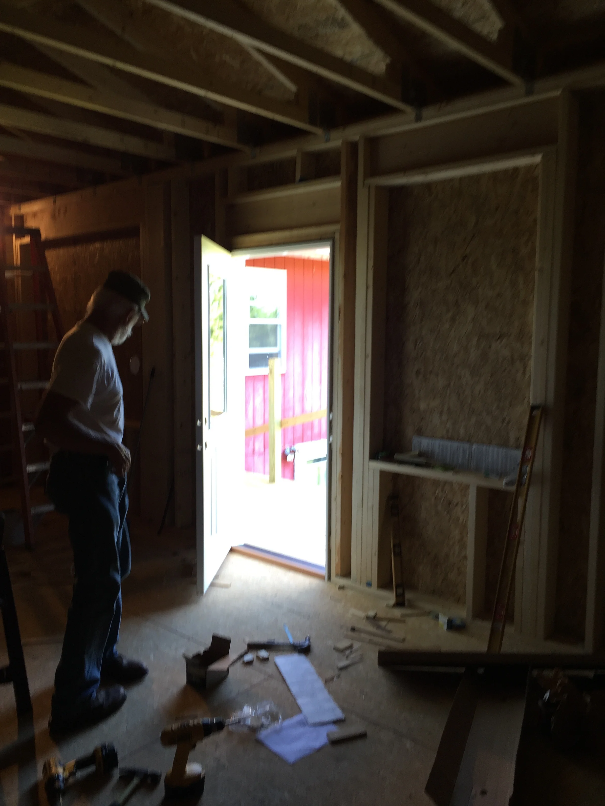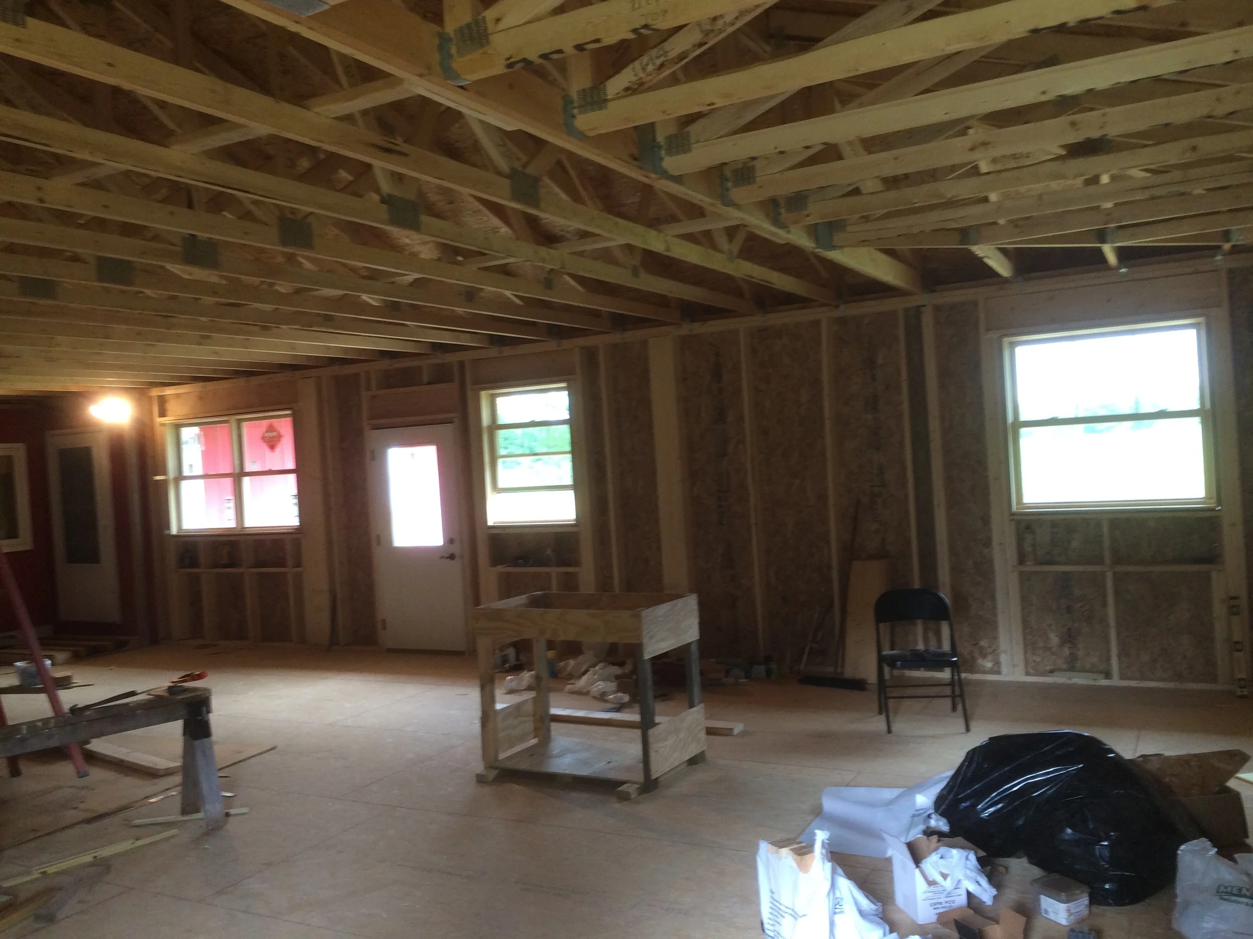 I helped hold the ladder. It was the least I could do. Or perhaps the most... Thank you Sister Teresa for letting us have Douglas for the duration. Most of the addition is wired now, just waiting for insulation and wallboard. Plumbing and heating. Siding. There is more than enough to keep us busy, but this was a huge advance toward making the addition a space to live in.