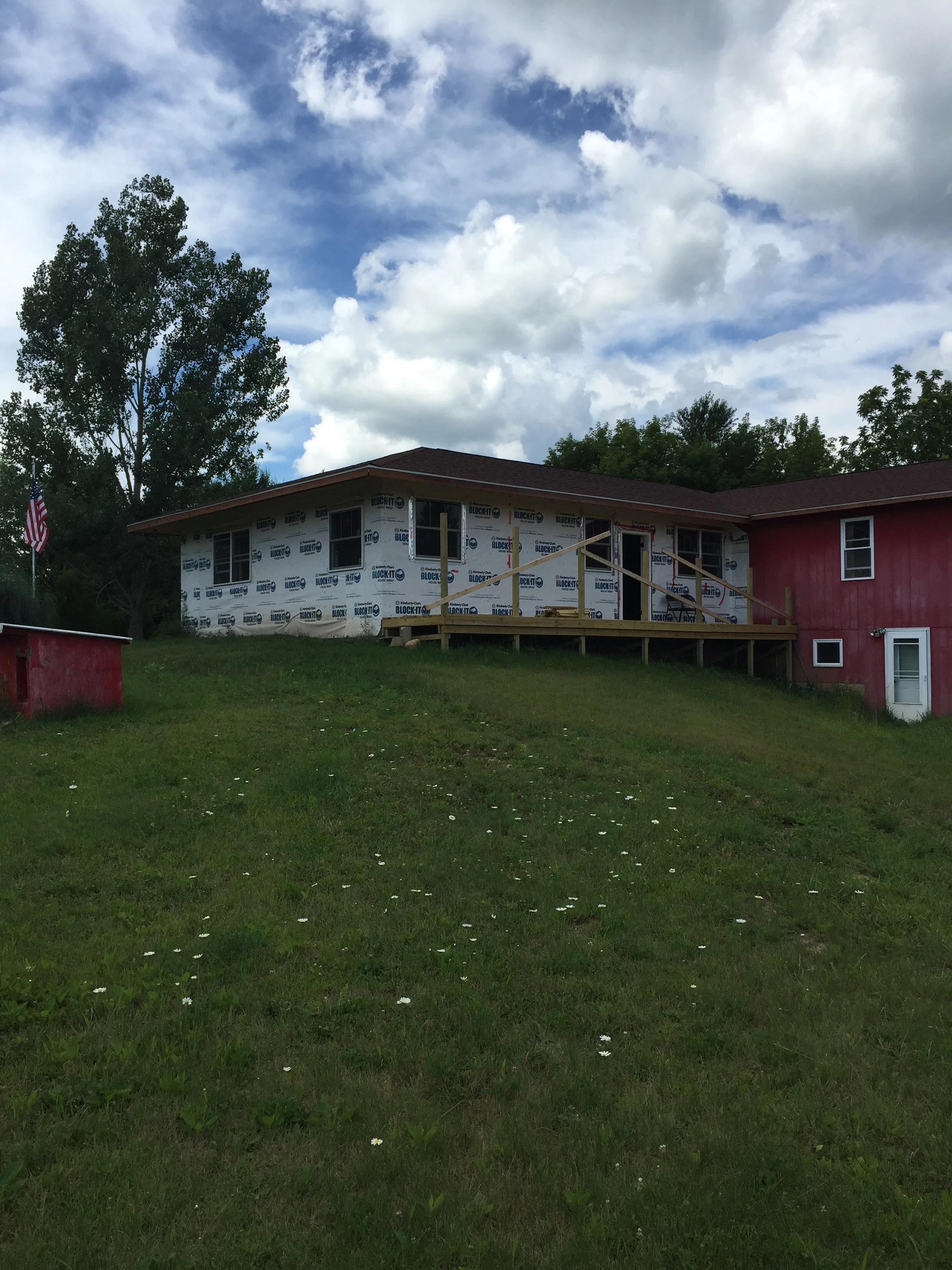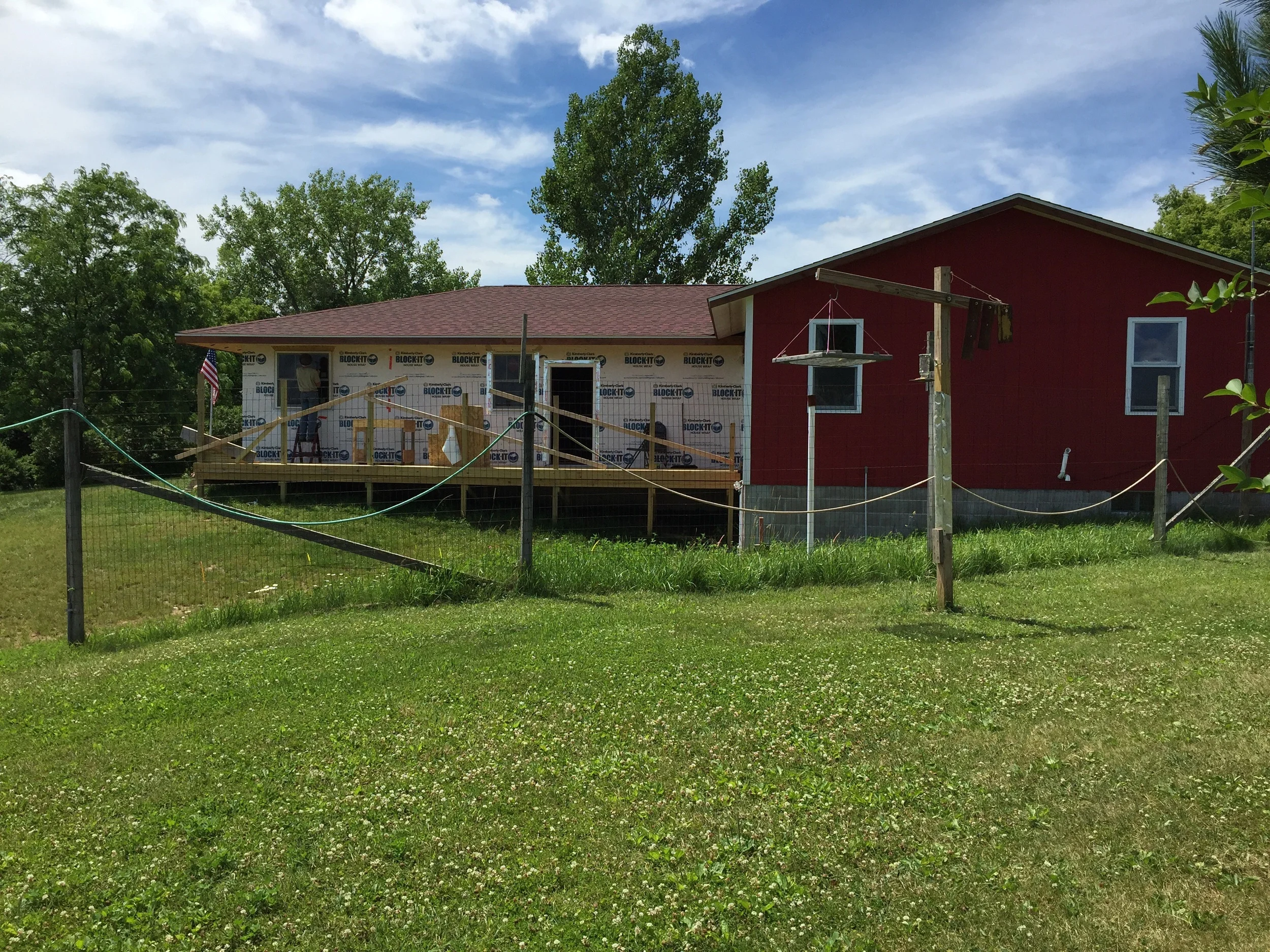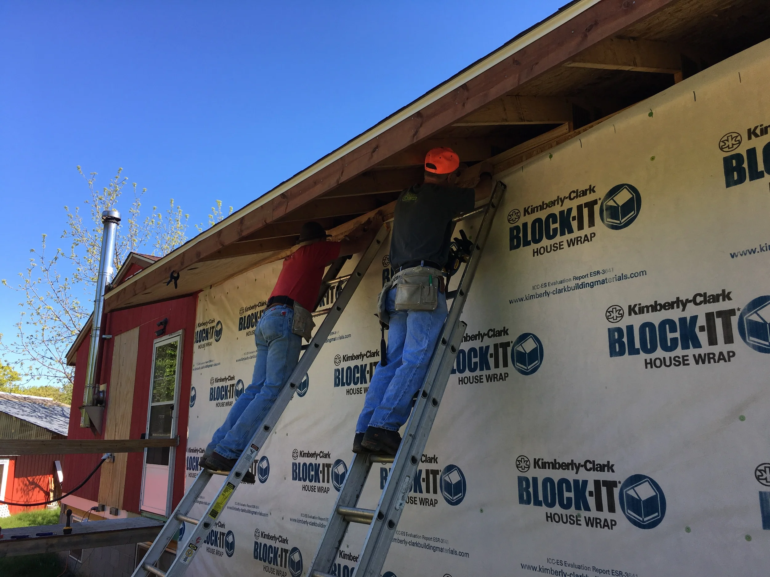 I helped hold the ladder. It was the least I could do. Or perhaps the most... Thank you Sister Teresa for letting us have Douglas for the duration. Most of the addition is wired now, just waiting for insulation and wallboard. Plumbing and heating. Siding. There is more than enough to keep us busy, but this was a huge advance toward making the addition a space to live in.