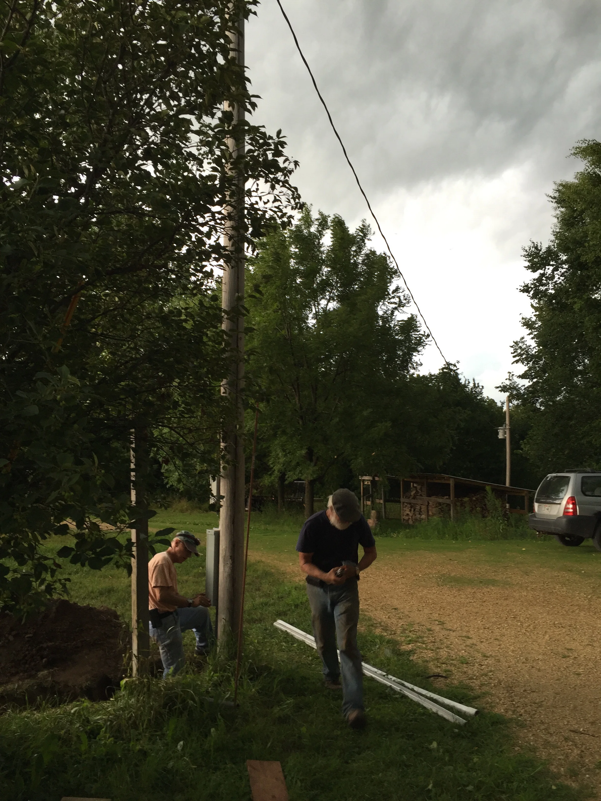 The first day the guys worked for 11 hours getting electricity in the ground and to the house so that when the power company guys came the next day, all that would need to happen would be to connect the box on the pole to the wires at the top.