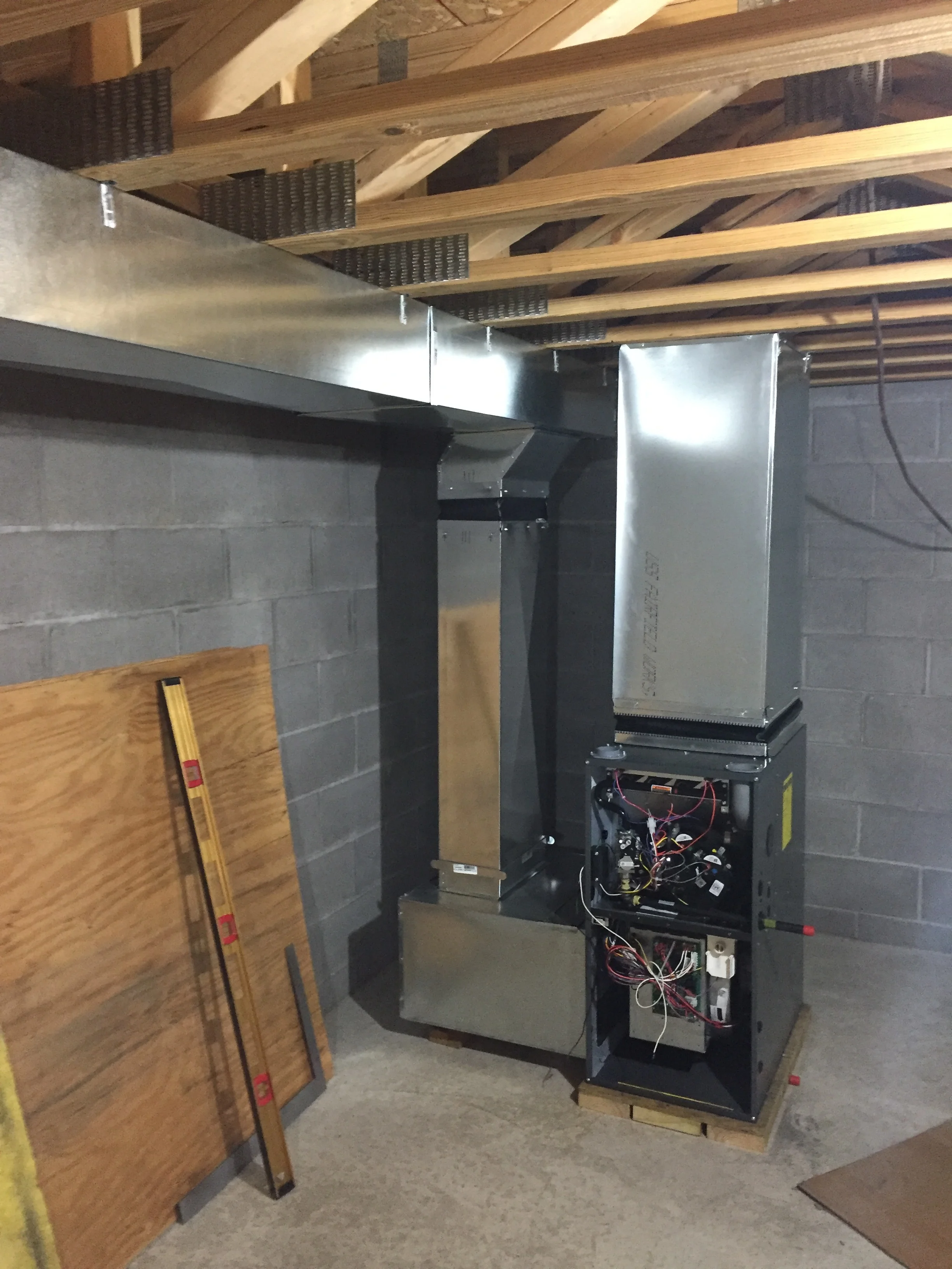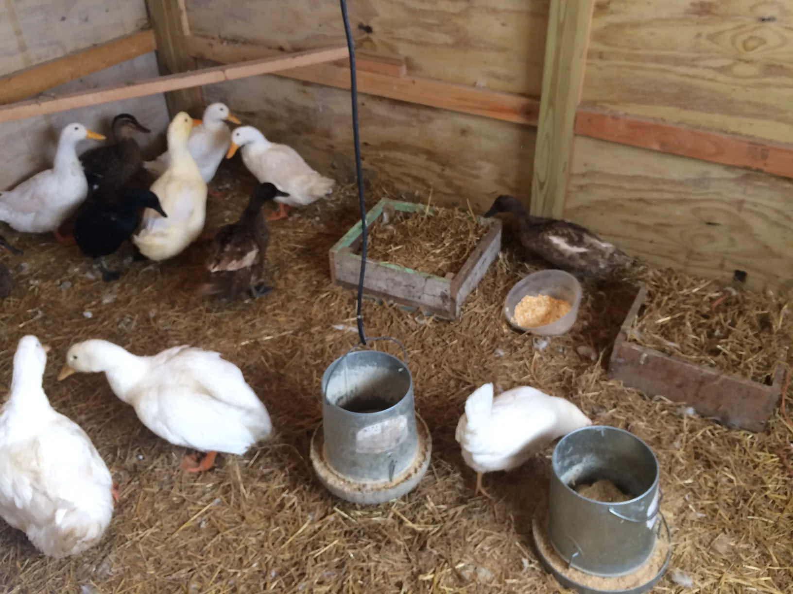 One end of the rope was tied to a branch and the other to the hitch of our car. The pulley is attached to a tree headed away from the garage, but still accessible to the driveway.