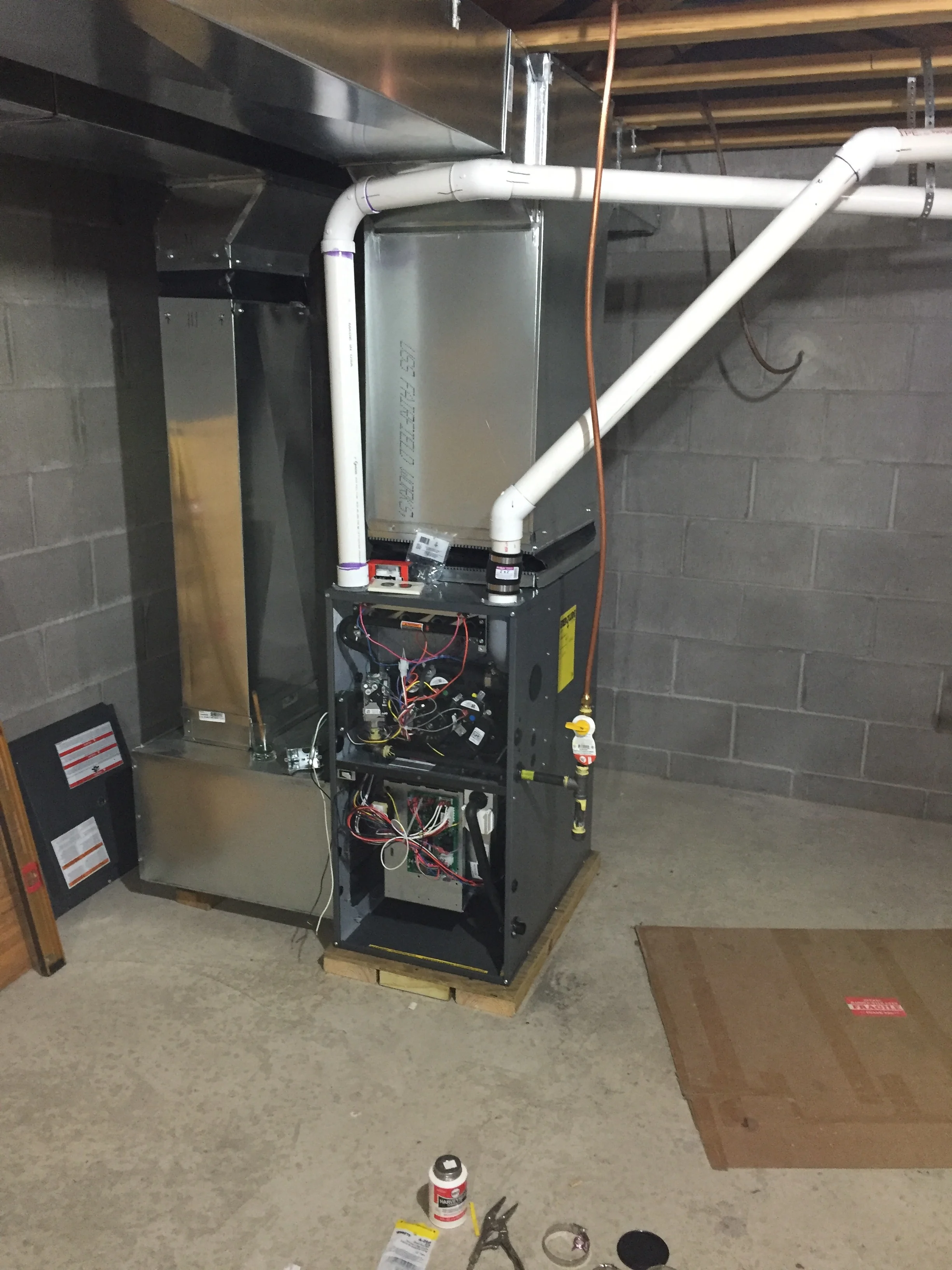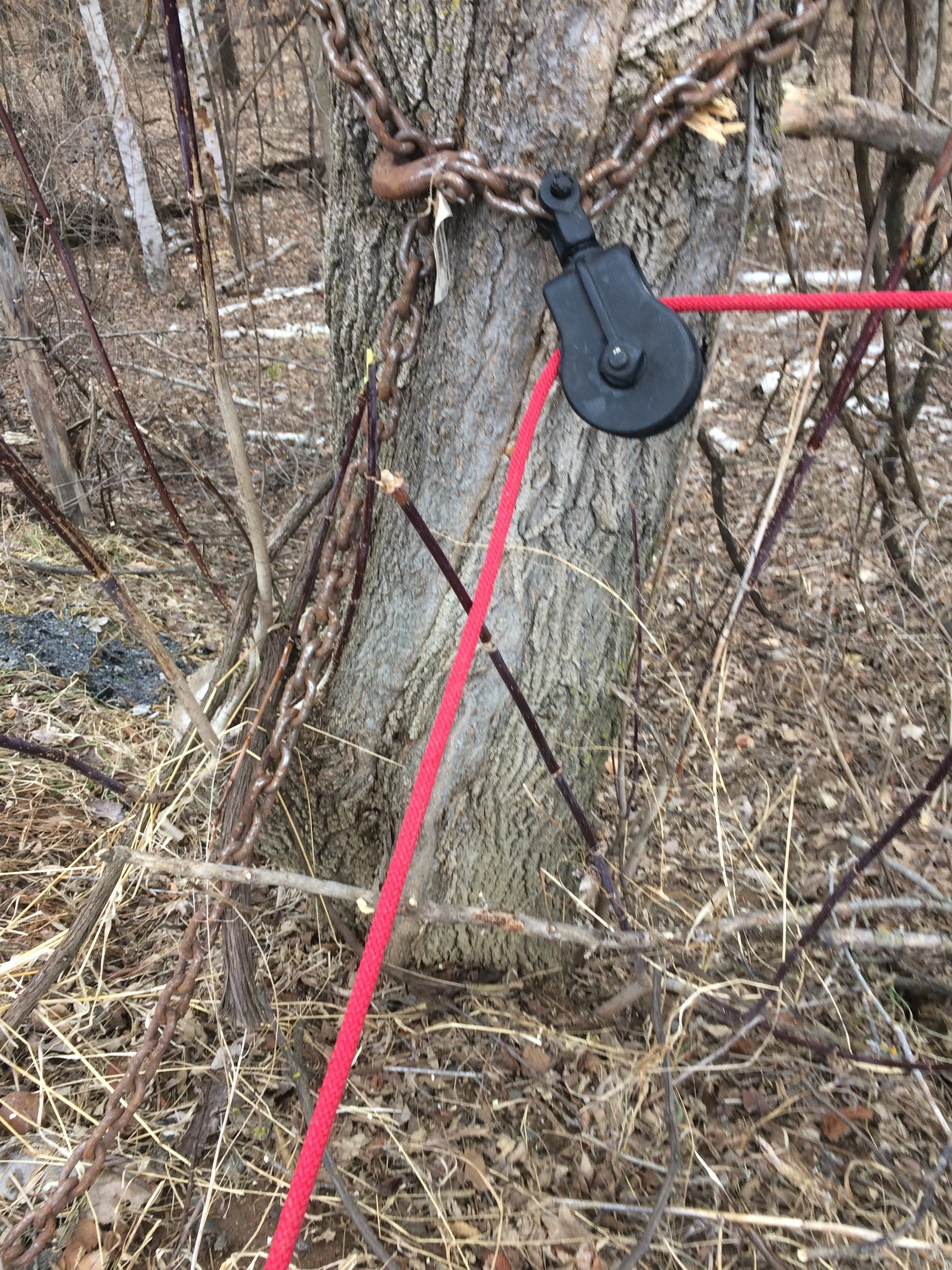 March is notoriously windy, and we both figured that if we didn't take quick action, we would soon find that nature had taken the tree down for us...and the garage (and Irene's car) as well. The problem was how to fell the fell fellow without squishing the garage or ourselves. So Michael consulted Brother Johnny, who is quite savvy about taking down trees and not the surrounding buildings. He suggested a pulley. So Michael hopped on the computer and ordered us a likely looking piece of hardware.