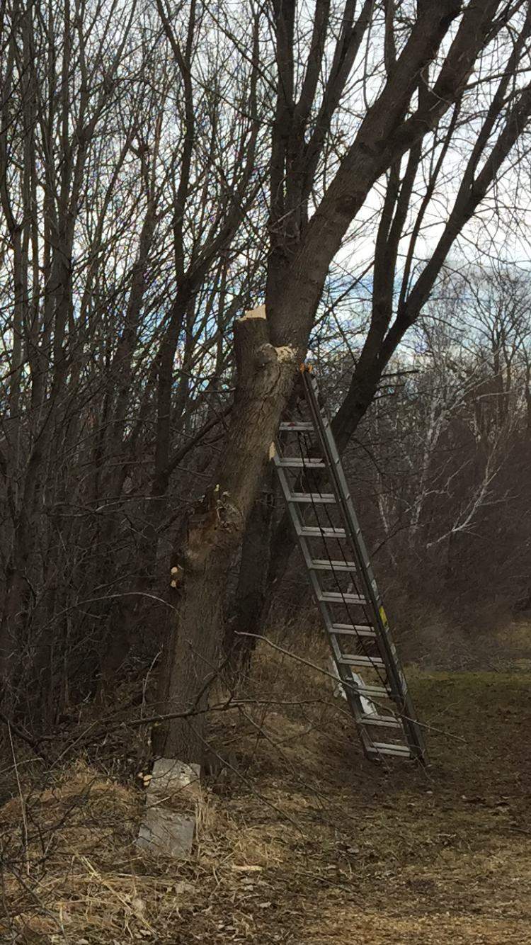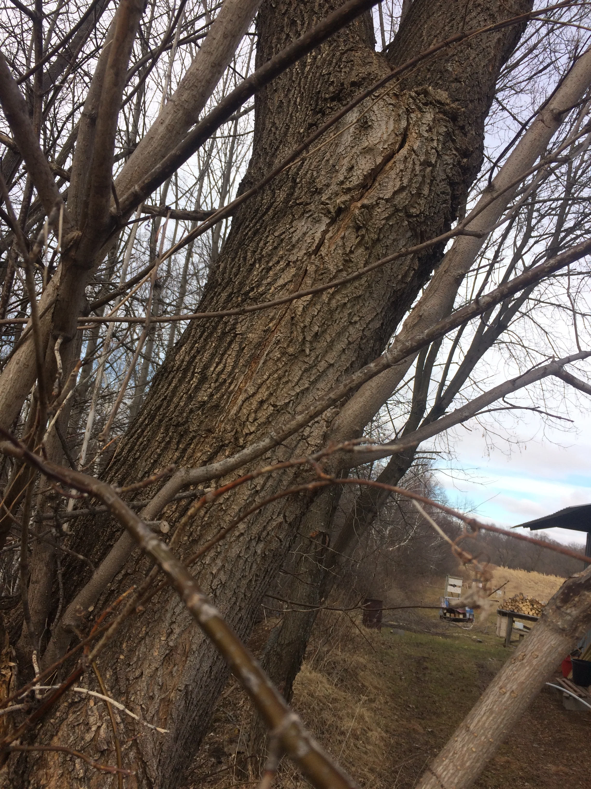 The warm weather of February got Michael out and about, when he noticed that the box elder next to the small garage had developed a bad split.