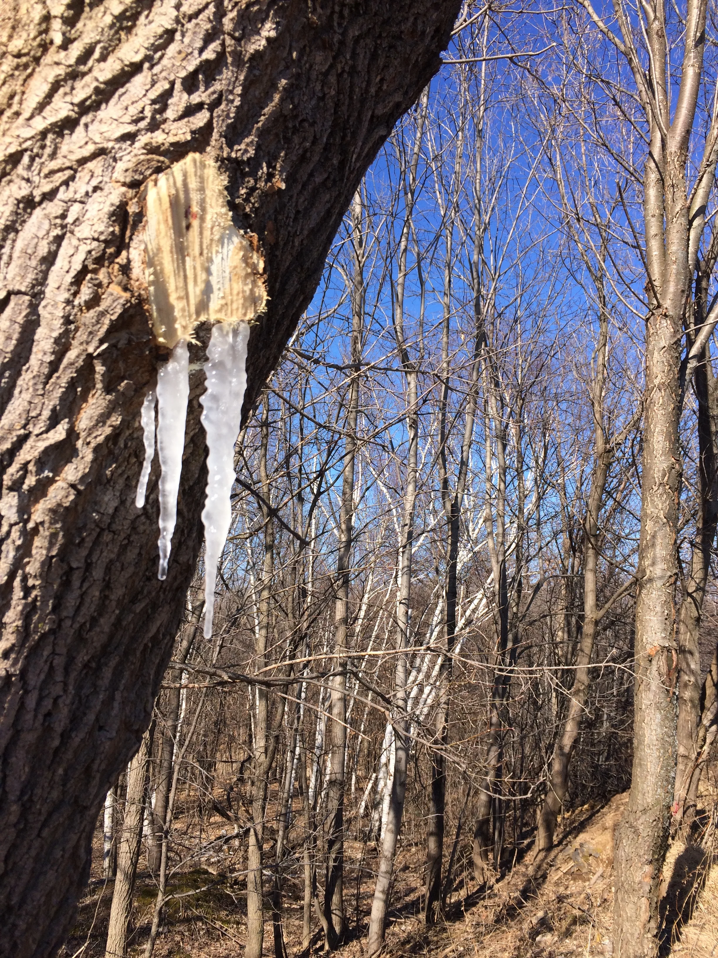 The split, which was only a couple of feet long at the beginning of February extended all the way down the trunk by the end of February.